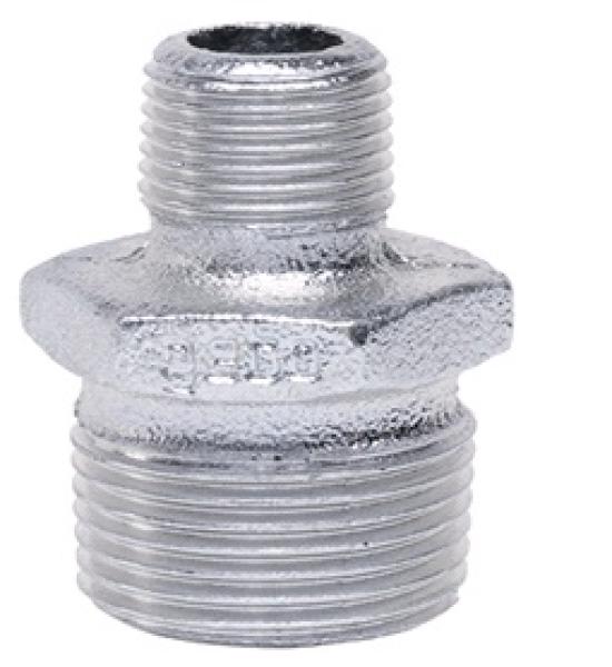 Ниппель переходной с резьбой 1 1/2" х 1 1/4", предназначенный для соединения труб разного диаметра. Изготовлен из ковкого чугуна. Вес: 0.3 кг.