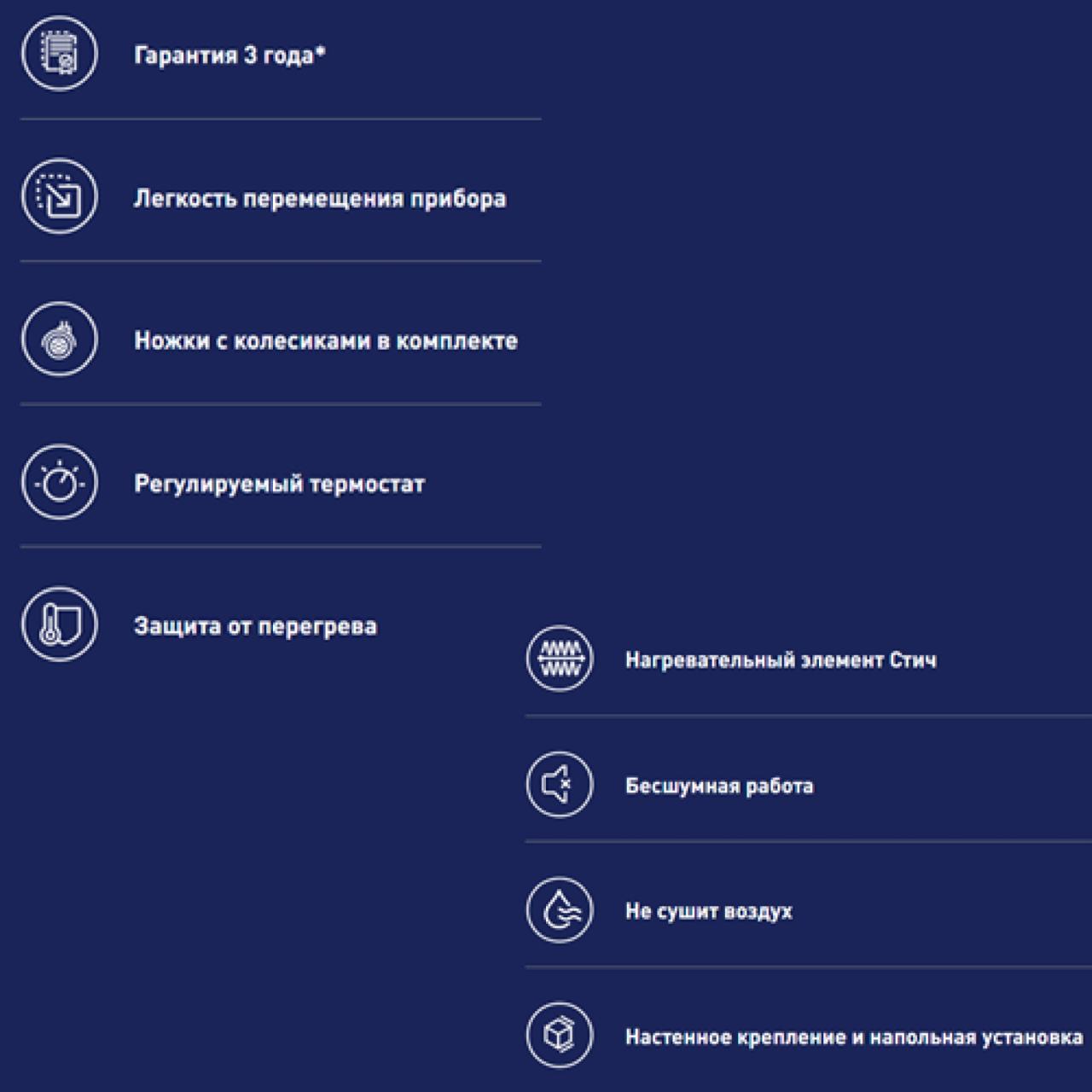 Комплектация: Конвектор - 1 шт; Ножки, колесики и крепежные болты - 1 комплект; Монтажный комплект - 1 шт; Инструкция с гарантийным талоном - 1 шт