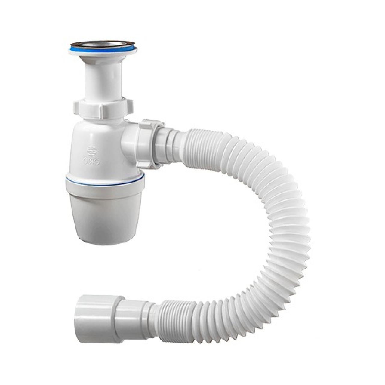 Бутылочный сифон с литым выпуском 1 1/2", гибкой трубой диаметром 40-40/50 мм. Вес: 0.3 кг.