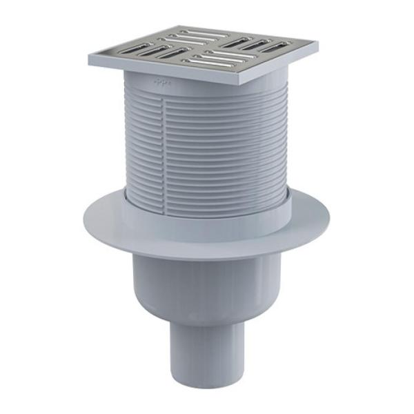 Сливной трап с прямой подводкой, комбинированным гидрозатвором SMART и решеткой из нержавеющей стали. Размер 105х105 мм, отвод 50 мм.