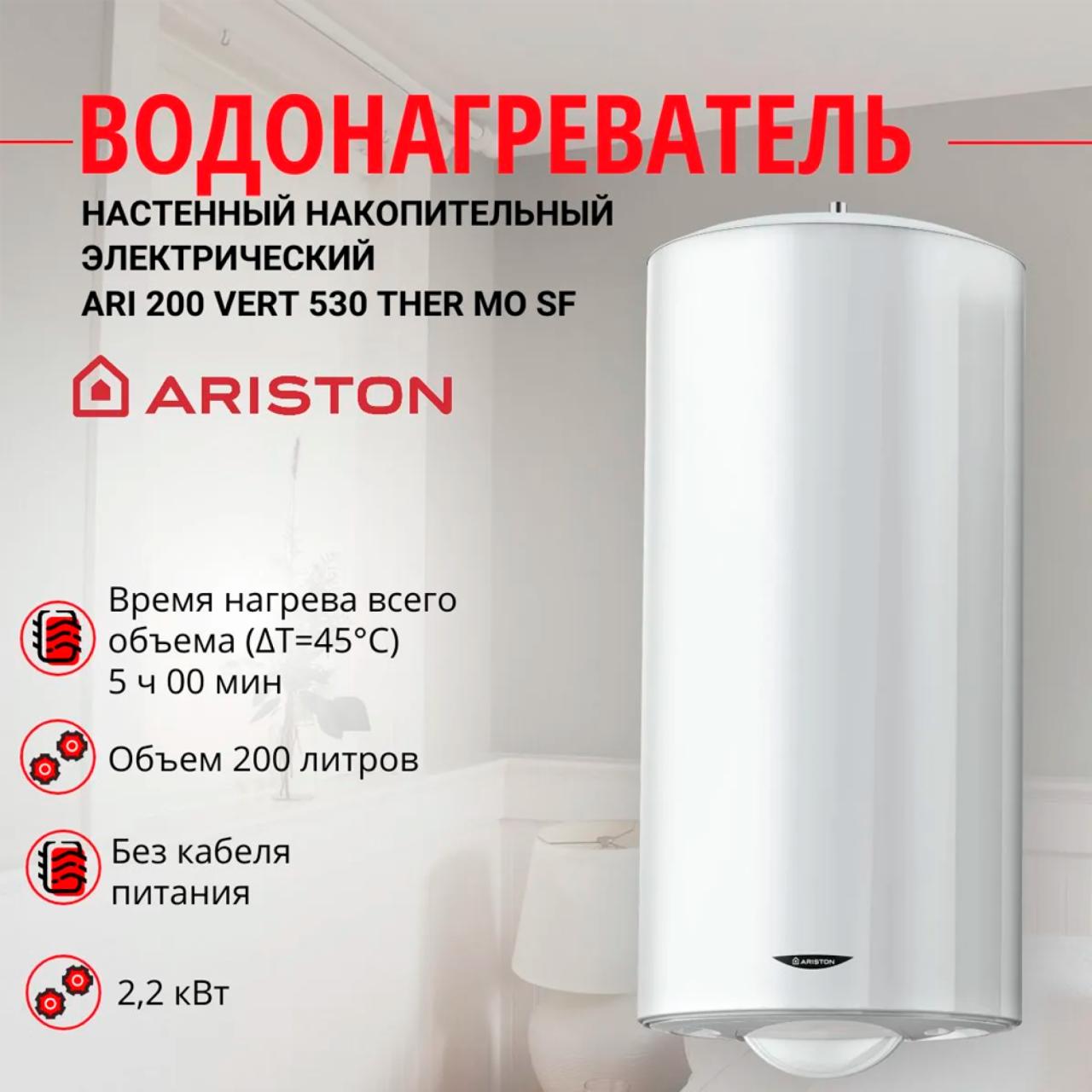 Настенный накопительный электрический водонагреватель ARI 200 VERT 530 THER MO SF. Емкость прибора составляет 200 литров. Линейка прибор TI TRONIC INDUSTRIAL обладает большой мощностью. Бак от коррозии дополнительно защищает магниевый анод увеличенного типа. Бак может функционировать при температуре до 850 градусов благодаря эксклюзивному надежному покрытию эмалью Titanium +. Управление водонагревателем удобное и простое, механическое.