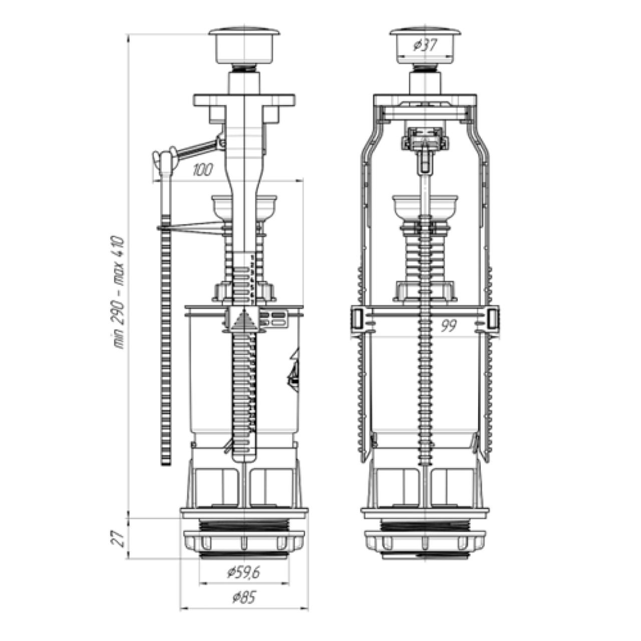 Регулировка высоты в диапазоне 290-410 мм подходит для различных моделей бачков.