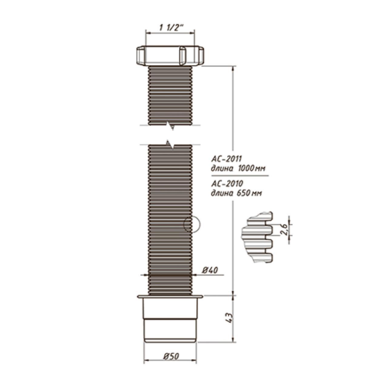 Гибкая труба 1 1/2" х 40 с переходником на 50 для соединения сифонов, которые имеют диаметр выхода 40мм и конусное соединение, с канализацией. Нельзя использовать с выпусками, которые имеют торцевые соединения. Длину трубы можно регулировать путём отрезания ненужного участка. Возможно подсоединение к канализации с диаметрами 40 и 50 (через переходник).