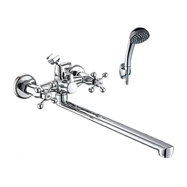 Двухвентильный смеситель для ванны с плоским прямым изливом и переключателем на душ. Вес: 1 кг.