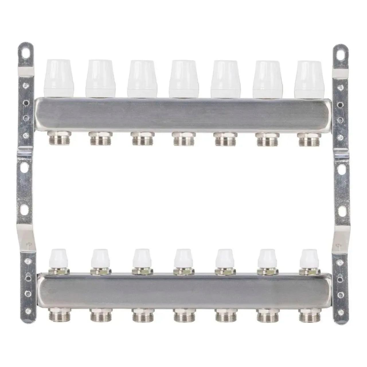 Коллекторный блок из нержавеющей стали с ручными регулирующими клапанами. Оснащен 7 выходами с присоединением Евроконус 3/4".