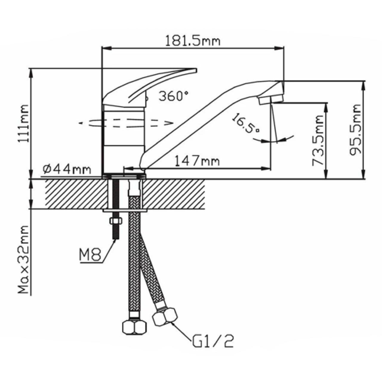 Для регулировки подачи воды используется керамический картридж диаметром 35 мм. Этот тип запорного клапана обеспечивает плавную и точную регулировку температуры и напора воды. Смеситель крепится на раковину с помощью шпильки, что обеспечивает надежное крепление и простоту установки. Гибкая подводка 1/2" длиной 35 см позволяет легко подключить смеситель к водопроводу.
