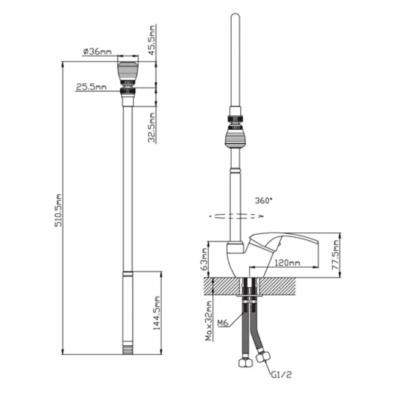 Смеситель крепится на раковину с помощью удобного крепежа на шпильке. Гибкие подводки 1/2" длиной 40 см.