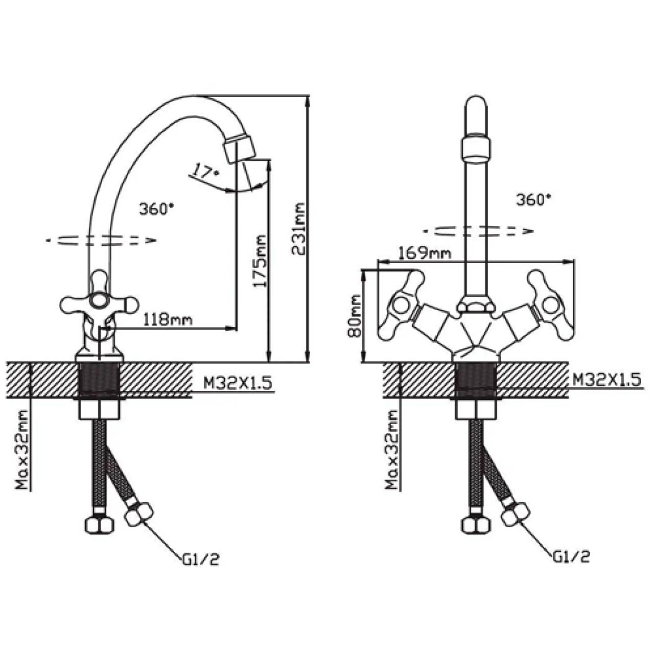 Для регулировки воды используются керамические кран-буксы 1/2", которые обеспечивают увеличенный срок службы. Смеситель крепится на мойку с помощью удобного крепежа на гайке, что обеспечивает надежное и прочное соединение. Смеситель подключается к воде с помощью двух гибких подводок 1/2" длиной 40 см, что обеспечивает удобство монтажа и простоту использования. Высота смесителя составляет 231 мм, а высота излива - 175 мм. Это делает его удобным для использования как взрослыми, так и детьми. В комплекте с смесителем идет все необходимое для установки: смеситель, подводка и крепеж.