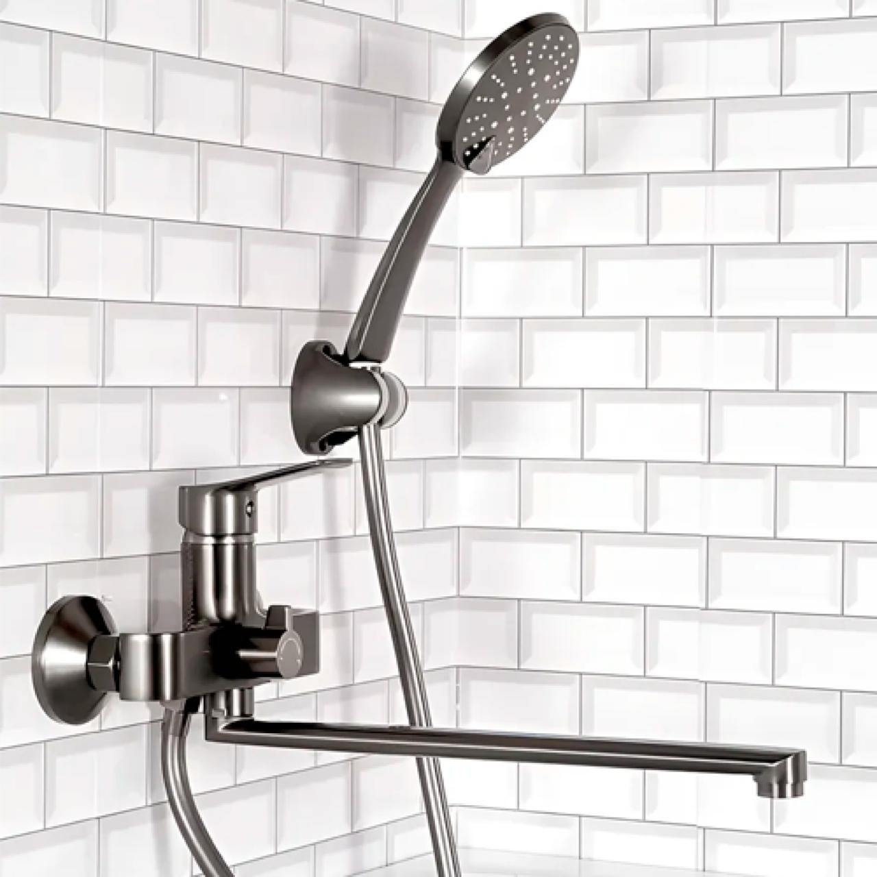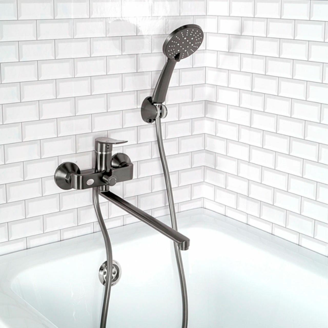Смеситель для ванны Д168-22QH с душем с длинным изливом 35 см в цвете Оружейная сталь. Универсальный кран на ванну изготовлен из качественной латуни. Поставляется в комплекте с душевым шлангом 1,5 метра, лейкой для душа 3-х режимной и настенным держателем для лейки. Керамический картридж 35 мм обеспечивает точную настройку температуры и напора горячей и холодной воды.