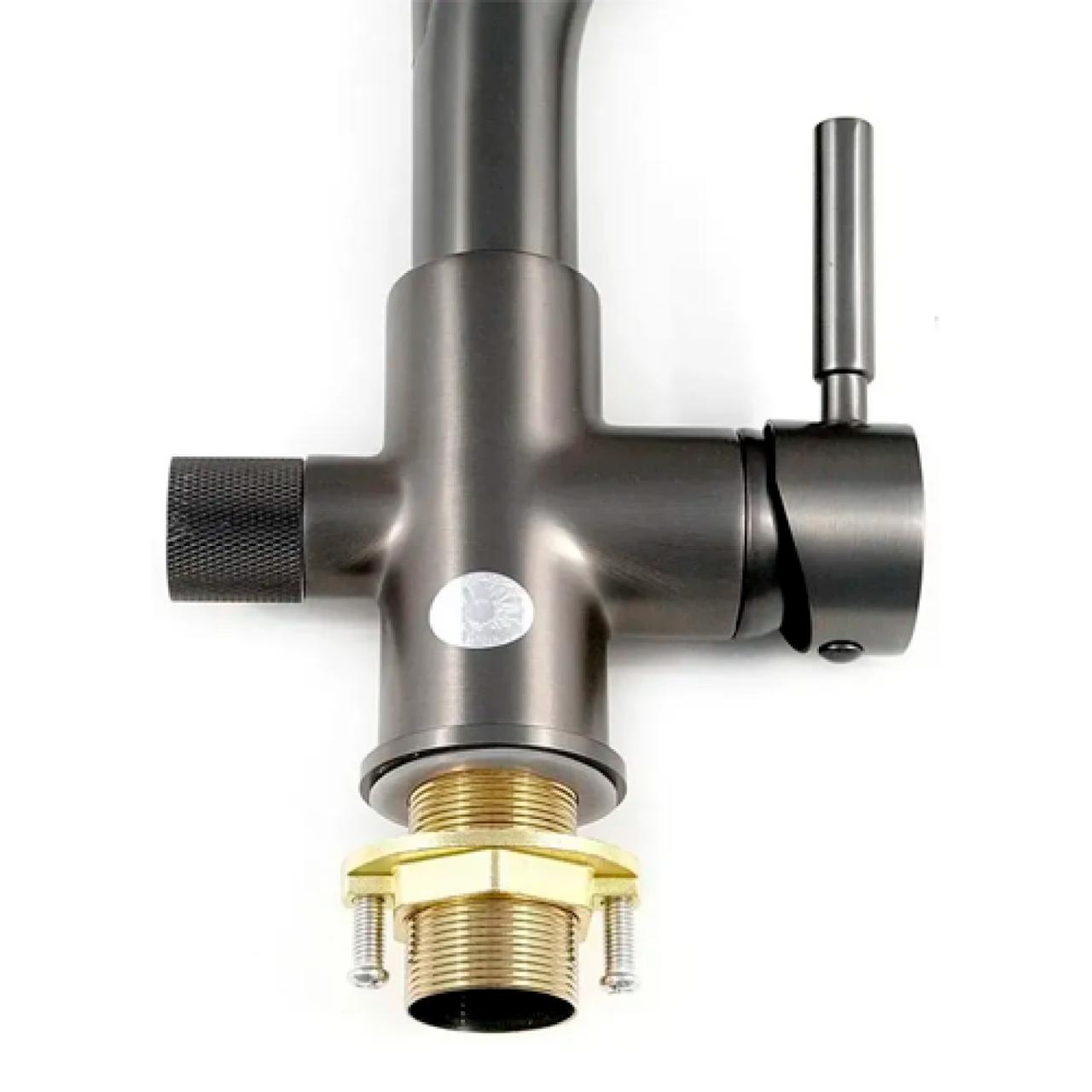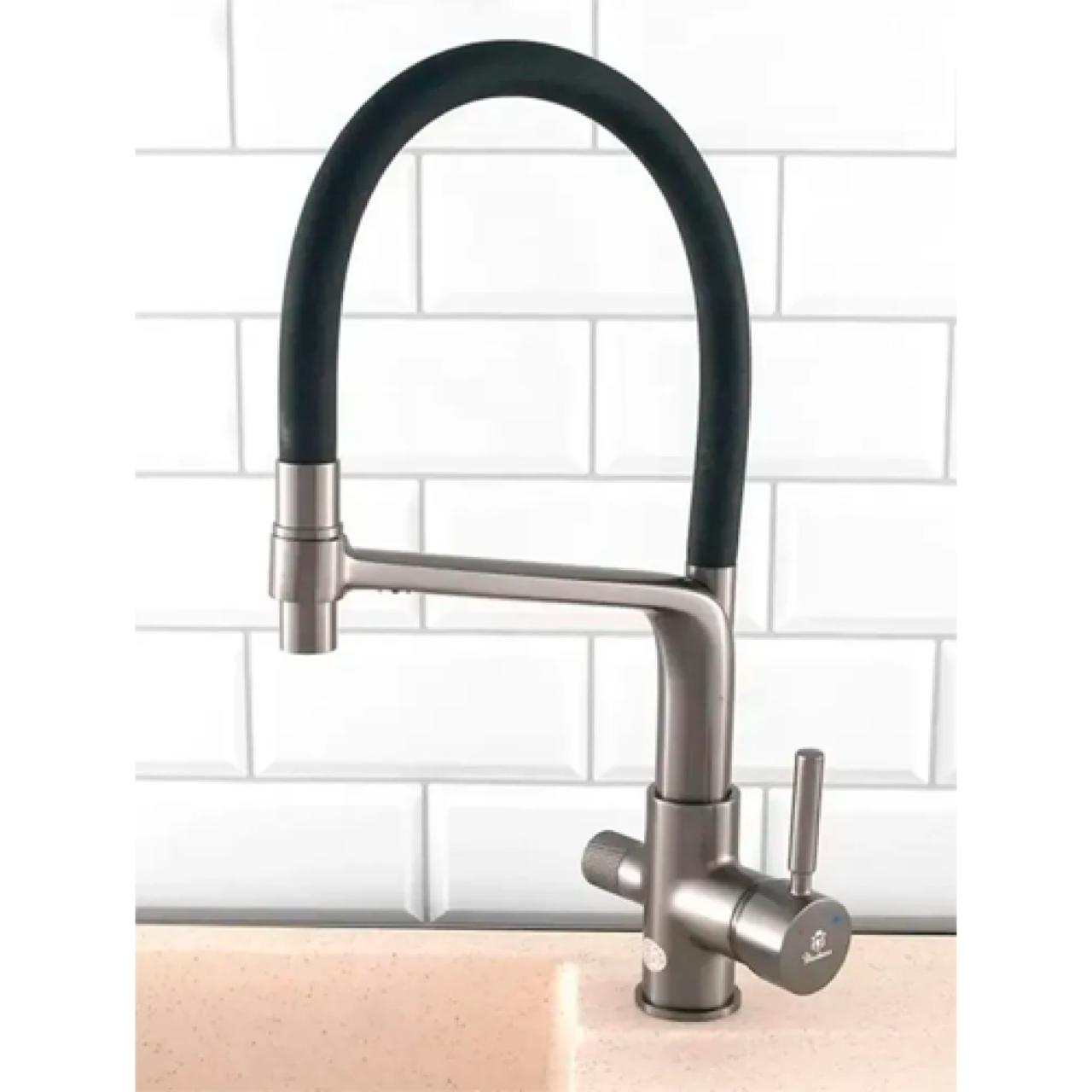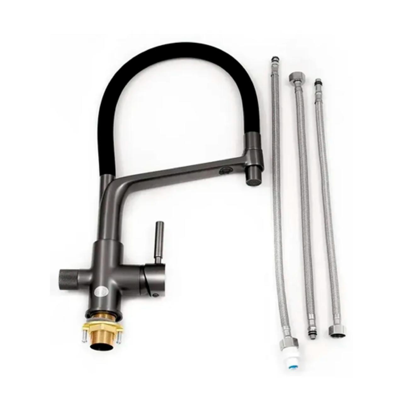 Смеситель для кухни Д49-19028QH с фильтром для питьевой воды - идеальное решение для тех, кто ищет сочетание высокого качества и доступной цены. Смеситель для кухонной мойки с гибким силиконовым изливом оснащен поворотным краном и водосберегающим аэратором для экономии воды и бесшумной работы, а так же экономичным керамическим картриджем для регулировки горячей и холодной воды. Высокий кран на кухню с подключением к фильтру питьевой воды.