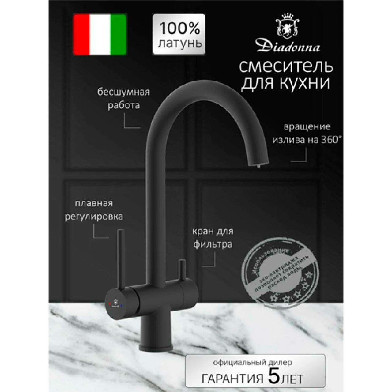 Смеситель для кухни Diadonna D49-19046BL изготовлен из высококачественной латуни. Прочное полимерное покрытие корпуса, цвета "черный", защищает от коррозии, улучшает внешний вид и облегчает уход. Излив у смесителя высокий, длиной 39 см. Внутри излива есть канал для фильтрованной воды, подаваемой из внешнего фильтра. Излив снабжён аэратором для насыщения струи воды пузырьками воздуха. Для регулировки смешанной воды применяется эко-картридж 35 мм с керамическими пластинами и увеличенным сроком службы. Такой картридж переключается со щелчками и позволяет фиксировать ручку в трёх положениях, тем самым экономя воду до 60% от полного открытия. Фильтрованная вода регулируется с помощью латунной кран-буксы с керамическими пластинами. К раковине смеситель крепится с помощью удобного крепежа на гайке. К воде подключается парой гибких подводок 1/2" длиной 40 и 45 см. Для фильтрованной воды дополнительная подводка 1/2" и пластиковый переходник для подключения к фильтру 1/2"х1/4".