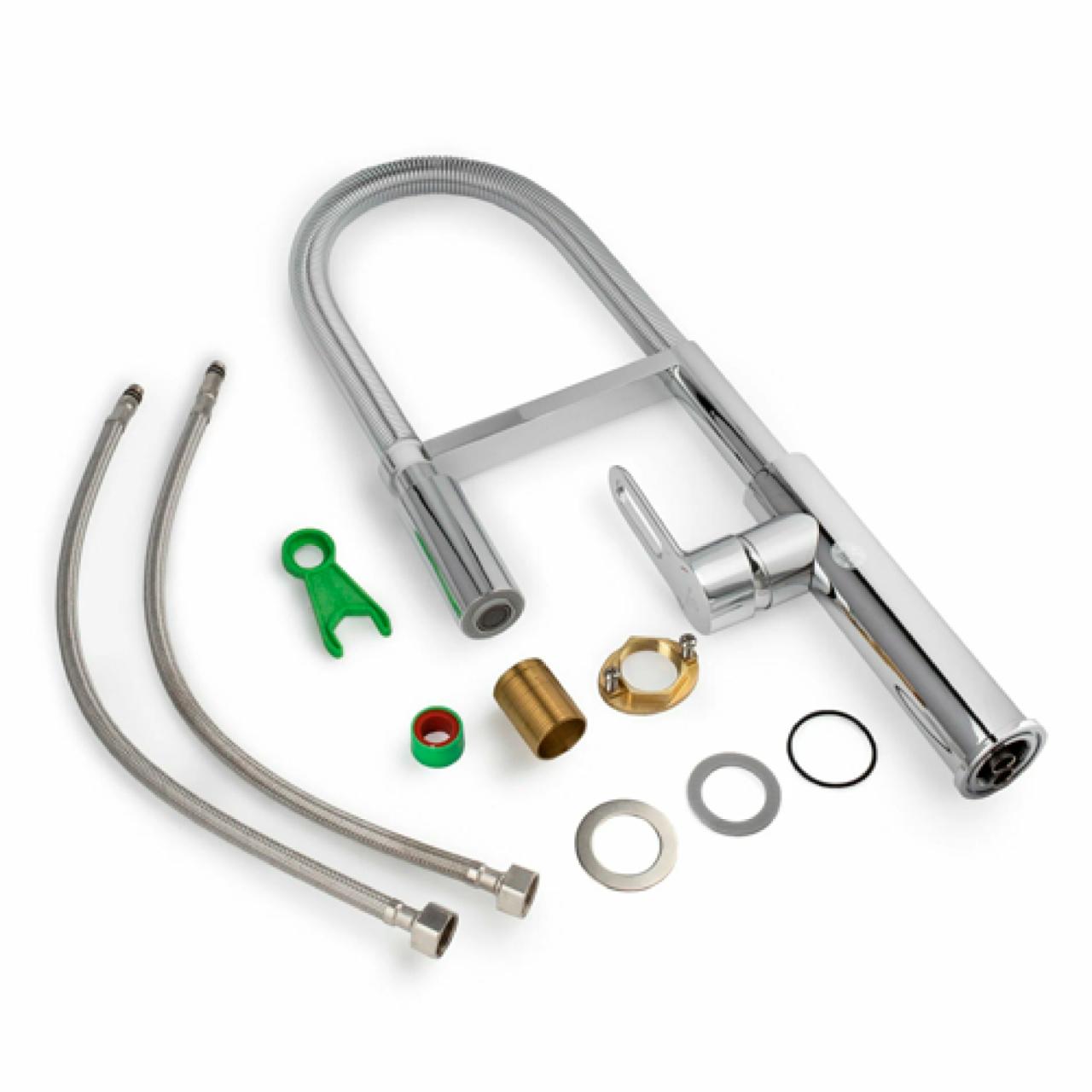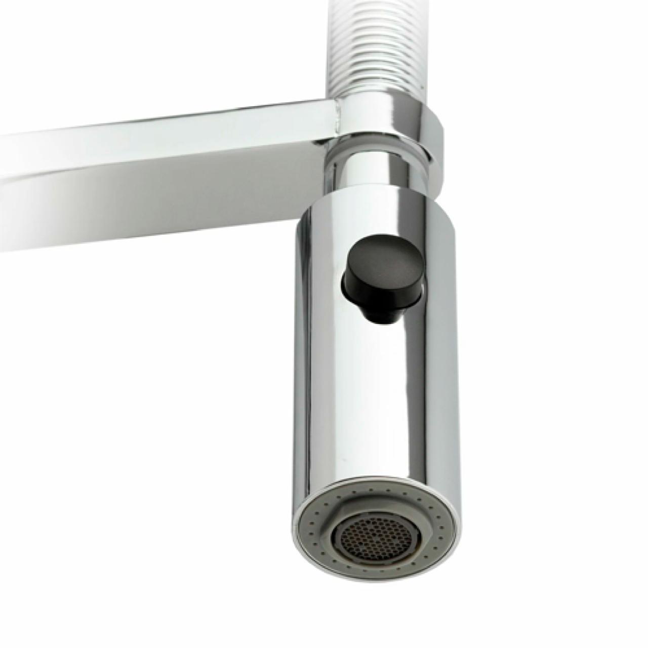 Смеситель для кухни D80-558113 с гибким вытяжным изливом с высоким изливом изготовлен из высококачественной латуни. Стильный дизайн смесителя с ручкой с плавным ходом и приятной работой картриджа. Цвет смесителя с вытяжным изливом - хромированный. Многослойное хромированное покрытие надежно защищает изделие от коррозии, а также делает его устойчивым к абразивным чистящим средствам. Керамический картридж 35 мм позволяет плавно регулировать температуру, а современный аэратор с переключением на душ обогащает поток воды кислородом, тем самым предавая воде мягкость и избавляя от брызг. Особенностью смесителя является так же выдвижной излив - с его помощью можно легко наполнять емкости любой высоты. Двухрежимный аэратор с функцией "Душ" позволяет облегчить мытье и ополаскивание посуды. Переключается на режим "душ" кнопкой расположенной на лейке-аэраторе.
