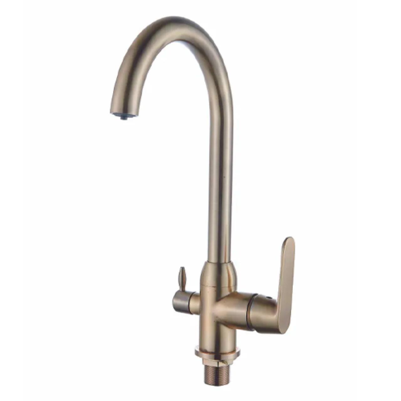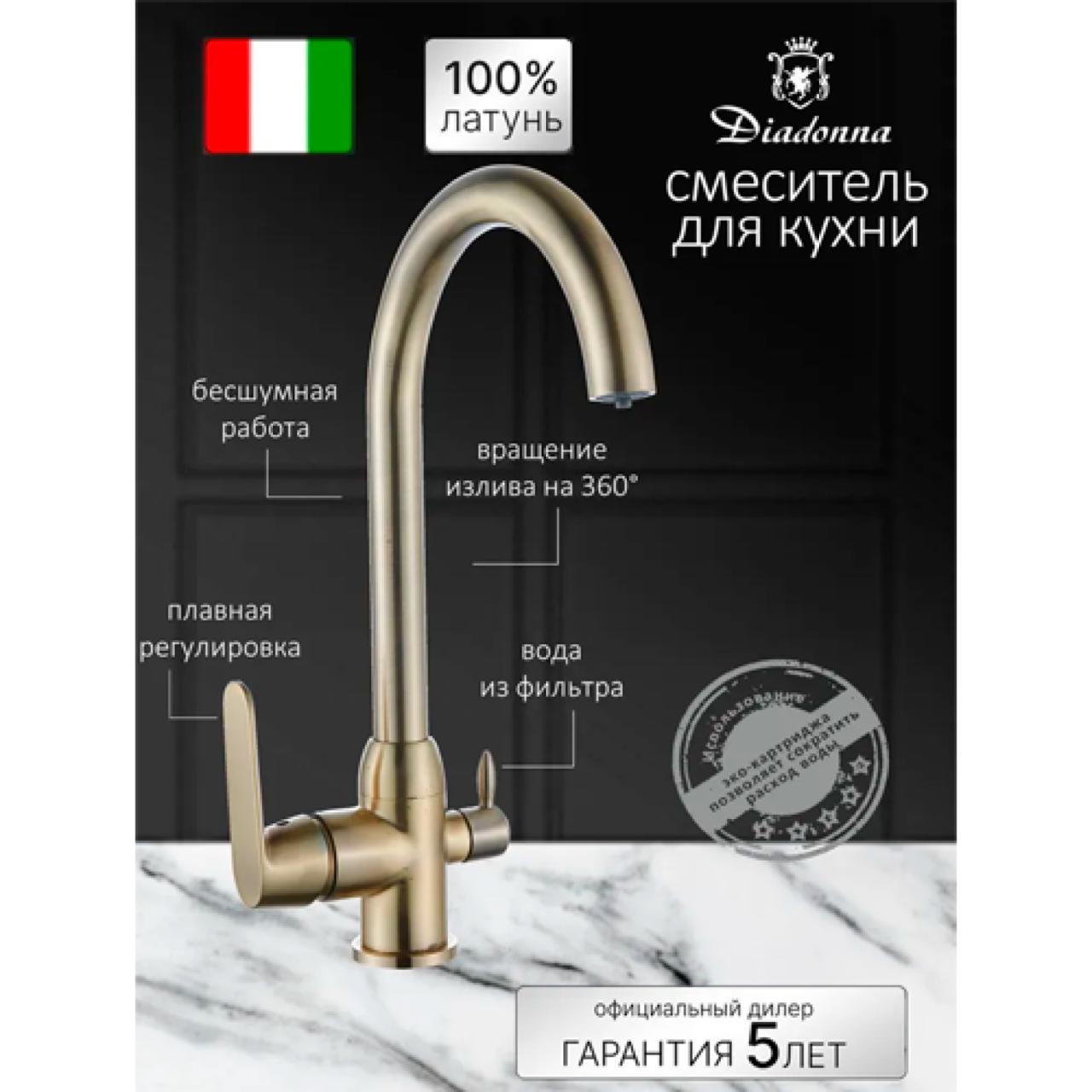 Смеситель на мойку Diadonna D82-446118Q - это элегантное решение «2-в-1» в изысканном цвете под золото, объединяющее подачу водопроводной и фильтрованной воды. Модель выполнена из высококачественной латуни и оснащена надежным керамическим картриджем, гарантирующим плавность хода и долговечность работы. Высокий излив обеспечивает максимальное удобство при наполнении глубоких кастрюль, а поворотный механизм расширяет рабочую зону мойки.
