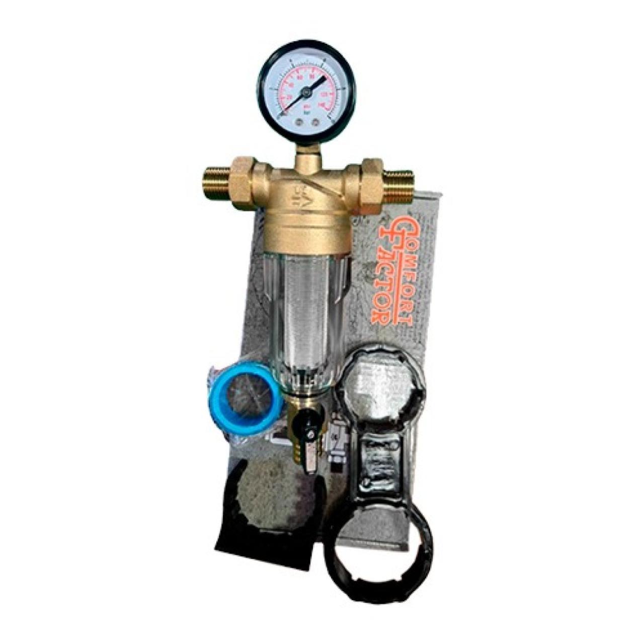 Фильтр тонкой очистки с манометром торговой марки Comfort Factor типоразмеров ½ и ¾, артикул FTO1, T – 40 ºC Латунь с прозрачным корпусом