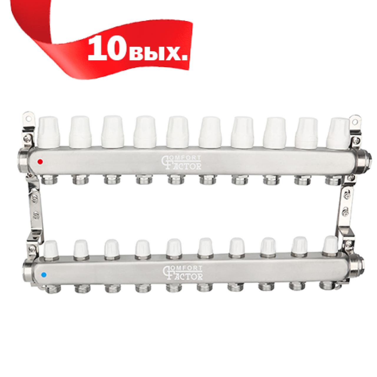 Коллекторная группа из нержавеющей стали с 10 выходами. В сборе с регулирующими и балансировочными клапанами.