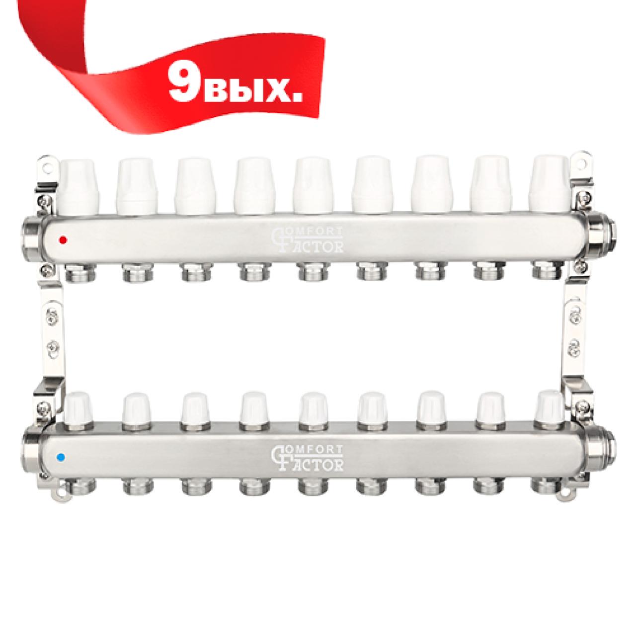 Коллекторная группа из нержавеющей стали с 9 выходами. В сборе с регулирующими и балансировочными клапанами.