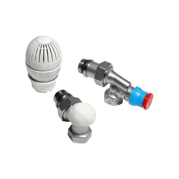 Термостатический комплект для отопительного прибора: термостатическая головка, термостатический клапан, отсечной клапан.