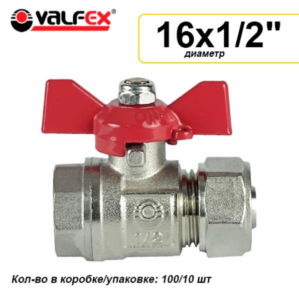 Кран шар. обжимной с переходом на ВР, ручка-бабочка VALFEX 16х1/2" НИКЕЛИР-Й (100/10) К