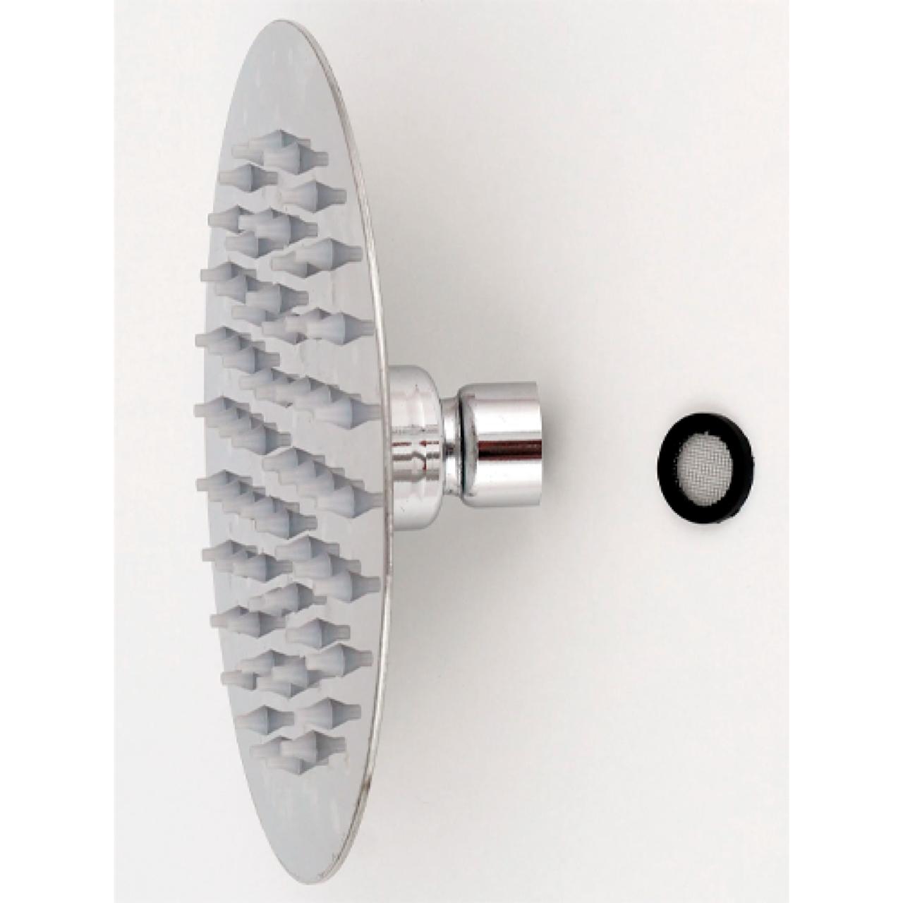 Лейка верхнего душа Potato P103-16 круглой формы, изготовлена из металла и покрыта хром-никелевым покрытием, что обеспечивает ей долгую и бесперебойную работу. Форсунки выполнены из самоочищающейся резины. Лейка крепится к выходу воды резьбой 1/2", что позволяет её использовать в большинстве душевых конструкций. Шарнир, на входе лейки обеспечивает наклон лейки в любом направлении. Диаметр лейки 16 см.