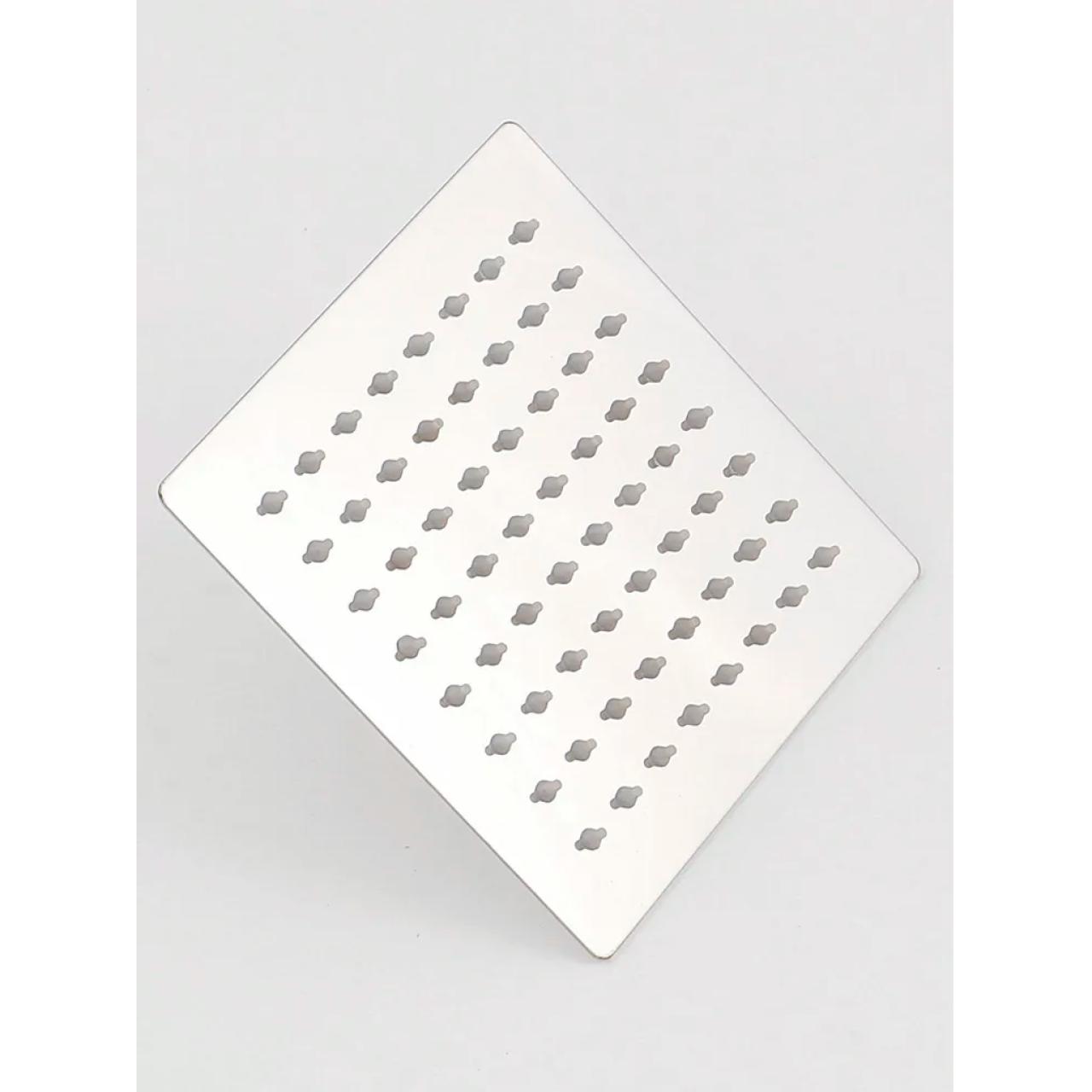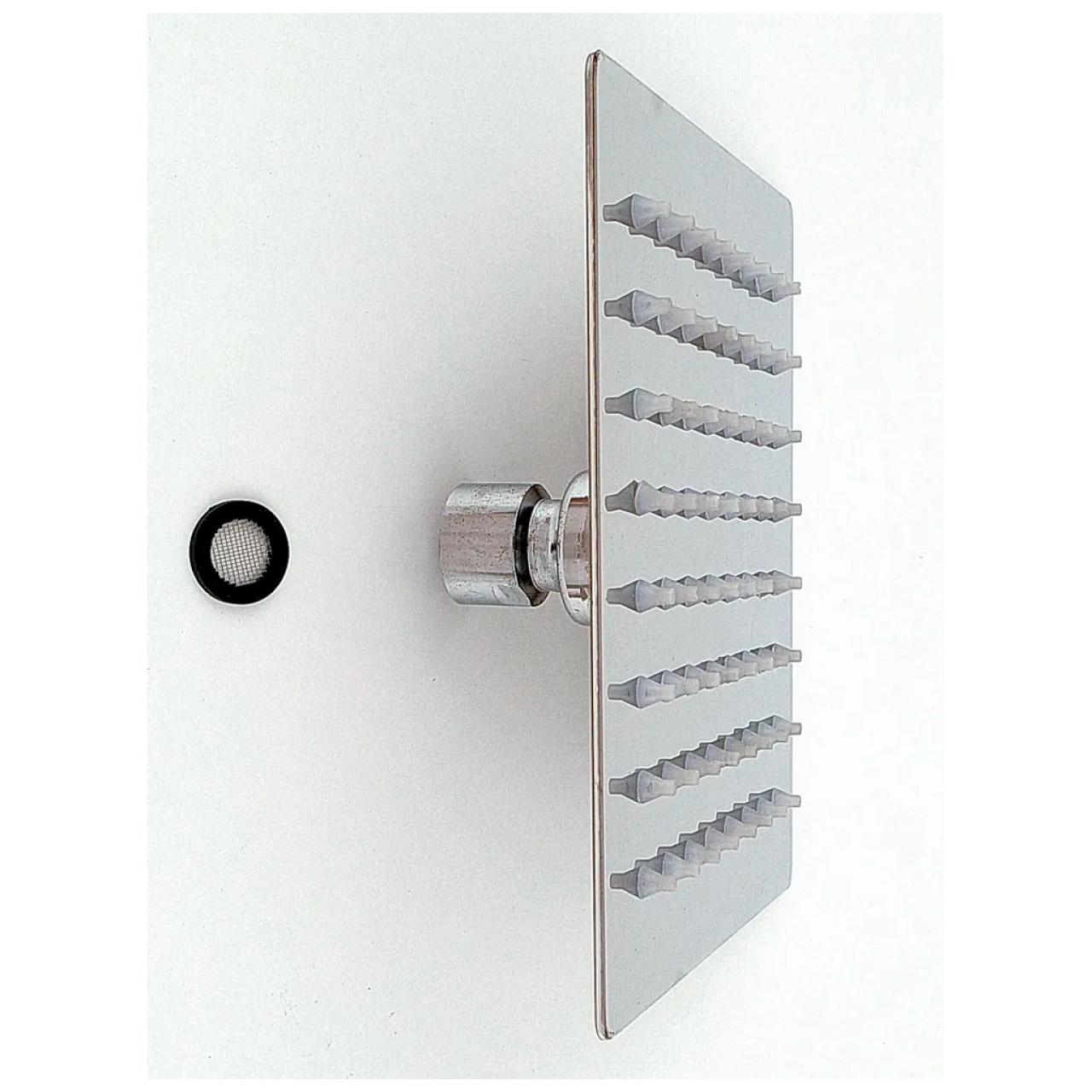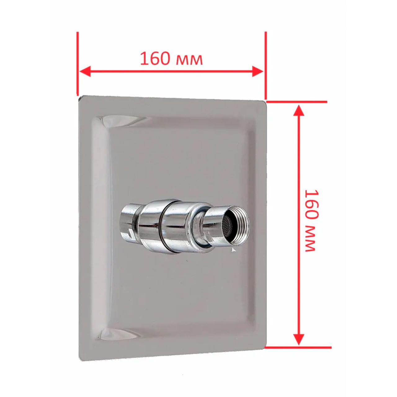Лейка верхнего душа Potato P104-16 квадратной формы, изготовлена из металла и покрыта хром-никелевым покрытем, что обеспечивает ей долгую и бесперебойную работу. Форсунки выполнены из самоочищающейся резины. Лейка крепится к выходу воды резьбой 1/2", что позволяет её использовать в большинстве душевых конструкций. Шарнир, на входе лейки обеспечивает наклон лейки в любом направлении. Размер лейки 16х16 см.