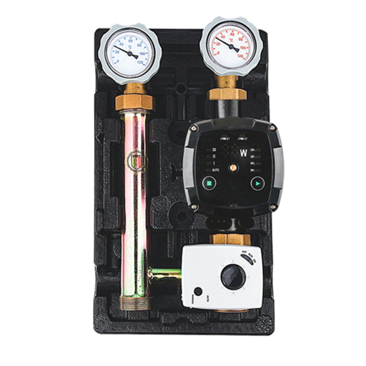 Группа с универсальным трехходовым термостатическим клапаном для автоматического регулирования температуры теплоносителя.