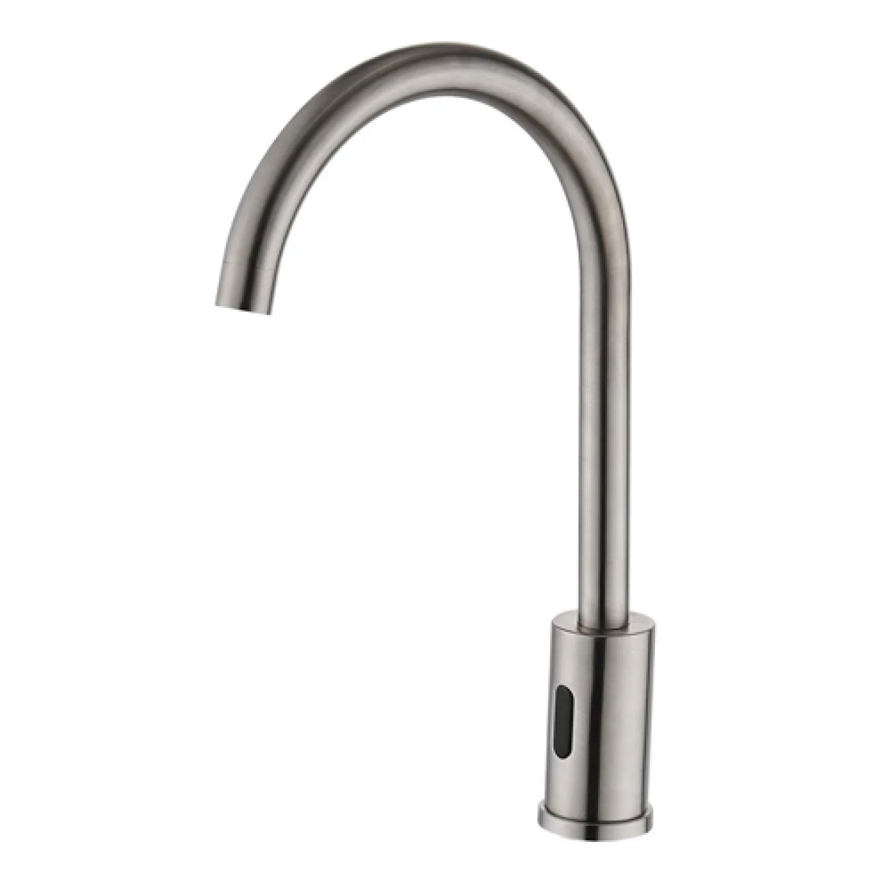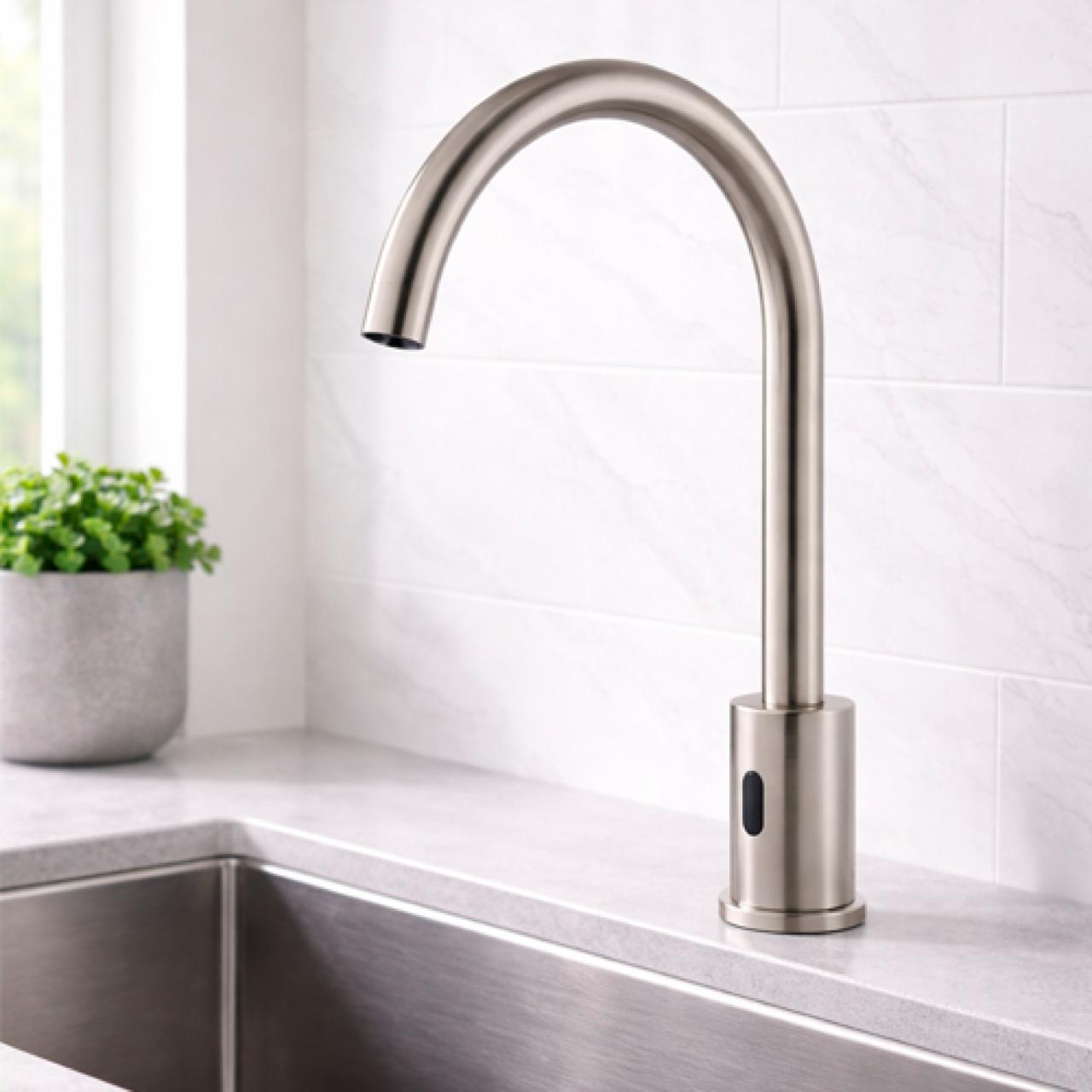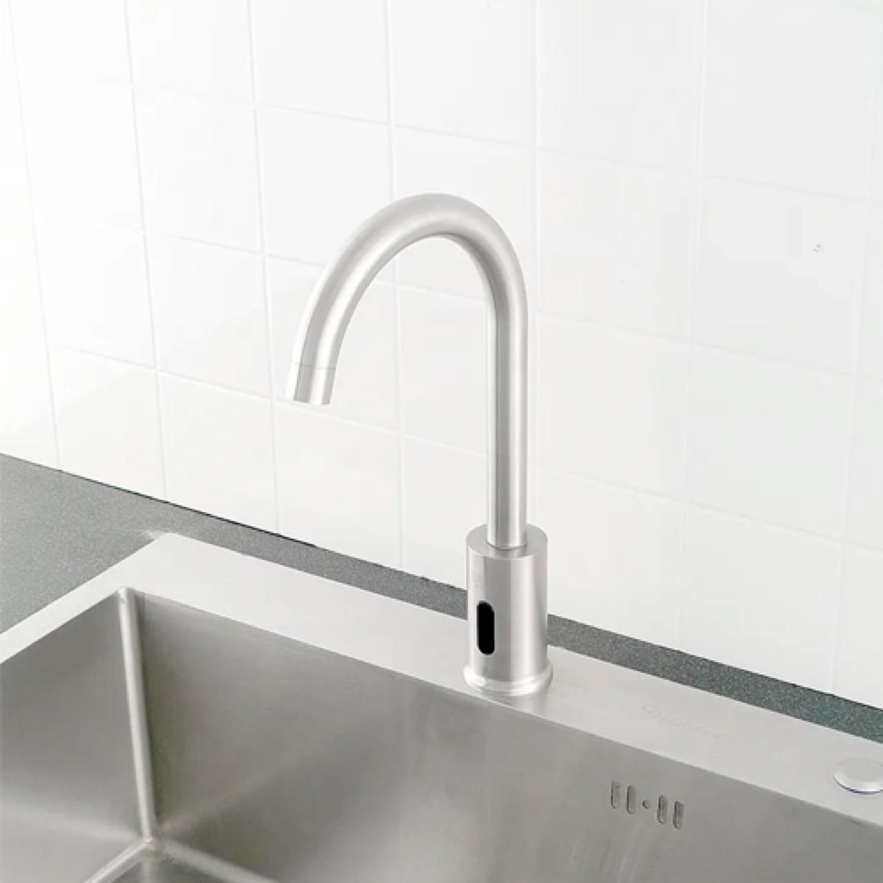 Сенсорный смеситель на кухню Potato P0080 изготовлен из высококачественной латуни. В комплекте со смесителем идёт блок смешивания воды с регулировкой температуры выходящей воды. Так же в комплекте блок автоматики, работающий как от сети 220В, так и от батареек. Блок смешивания, автоматики и кран соединяются подводкой 1/2".