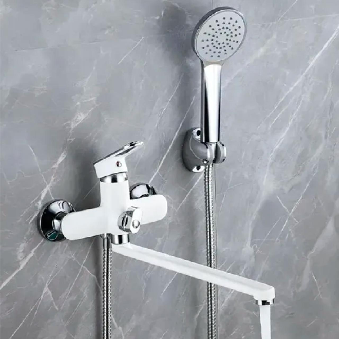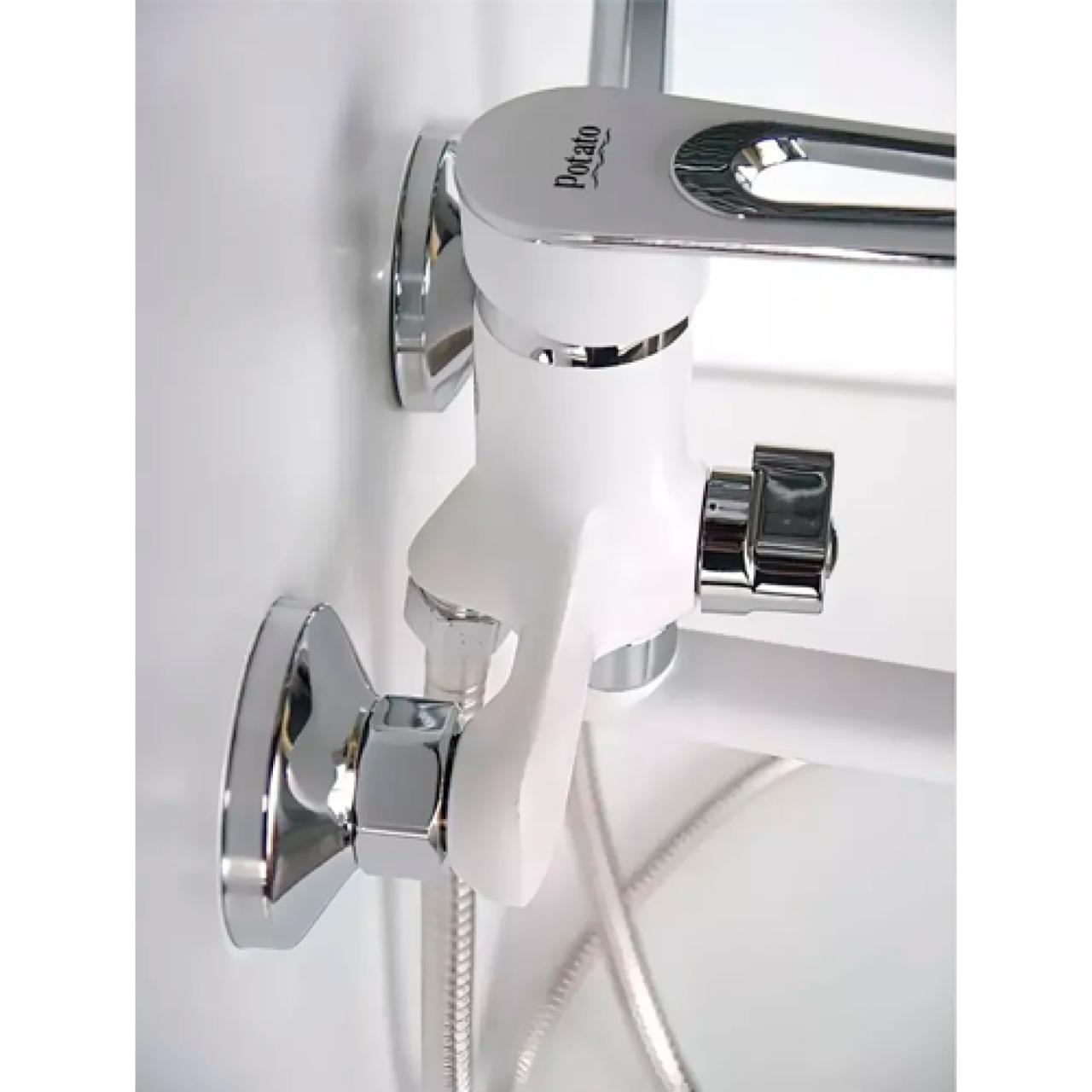 Смеситель для ванны с душем P22274-7 — универсальный рычажный смеситель с длинным поворотным изливом, который удобно использовать и для ванны, и для умывальника. Модель выполнена в стильном сочетании белого цвета с хромом, хорошо смотрится в современном интерьере. Регулировка напора и температуры воды осуществляется керамическим картриджем 35 мм. Длина поворотного излива — 35 см, что делает смеситель особенно практичным в повседневном использовании. Переключение на душ — поворотным дивертором на 90°. В комплекте есть всё необходимое для душа: шланг 1,5 м, лейка на 1 режим и настенный держатель. Для настенного монтажа предусмотрены эксцентрики с декоративными отражателями (2 шт).