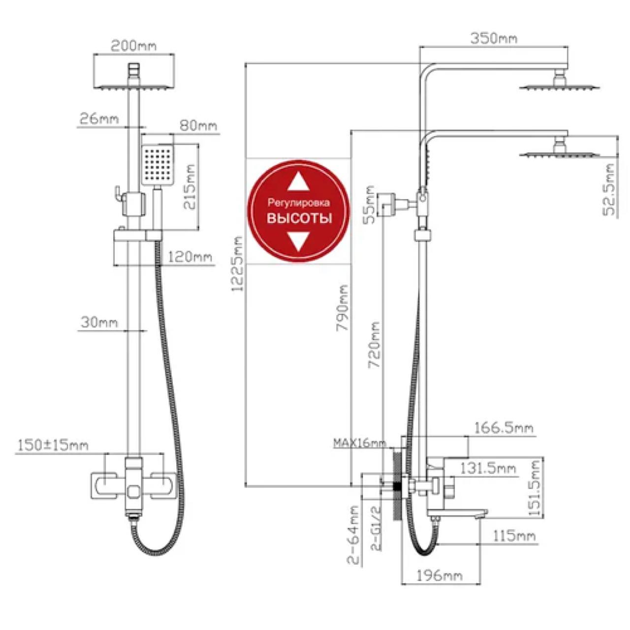 Комплектация: Душевая стойка со смесителем; Душевая лейка; Керамический картридж 35мм; Дешевой шланг; эксцентрики с отражателями