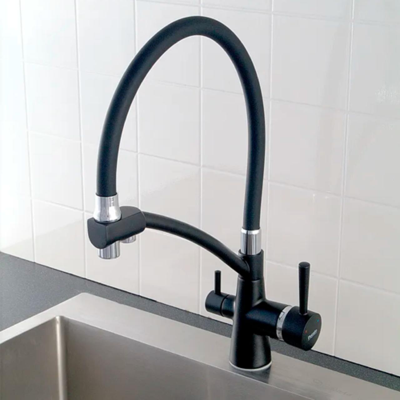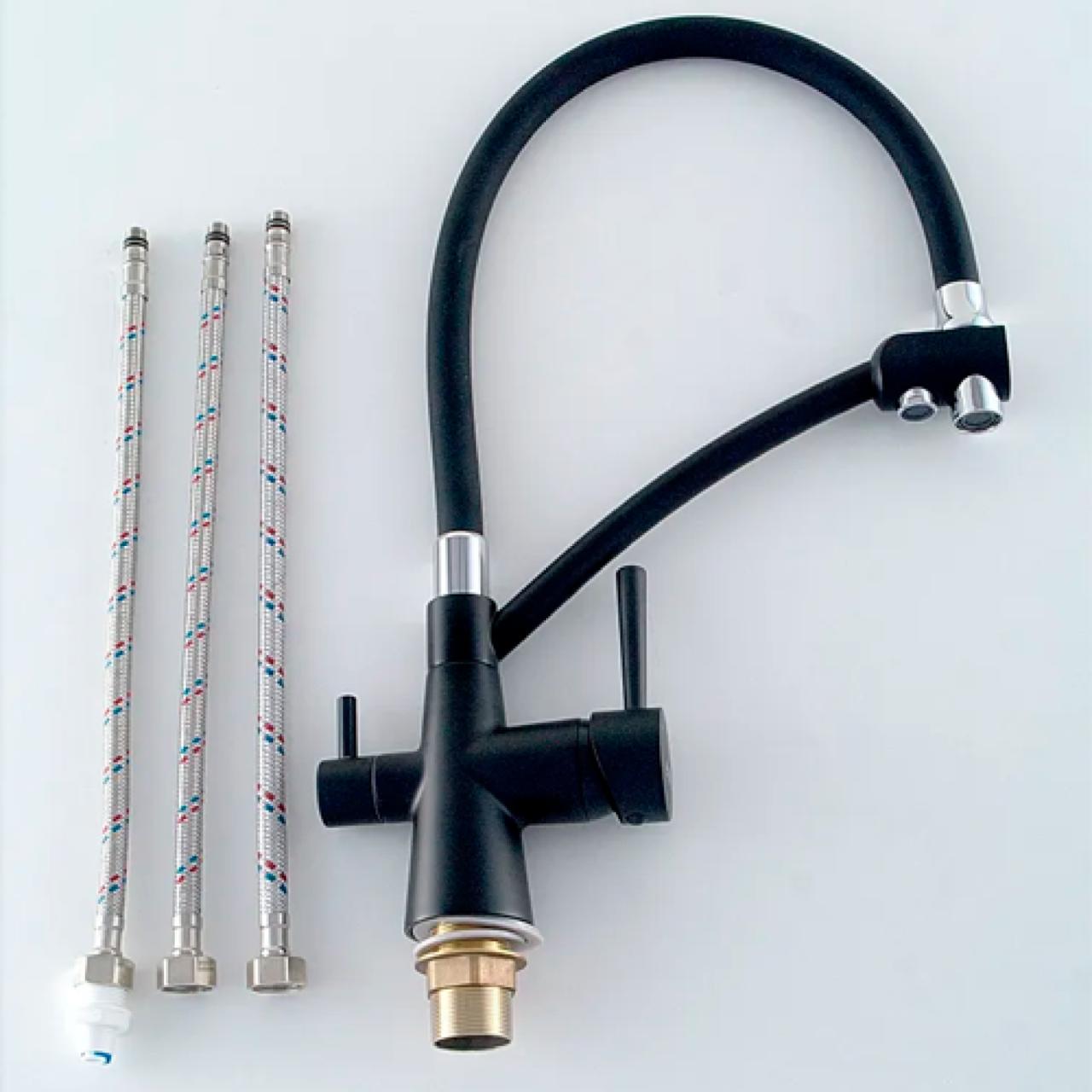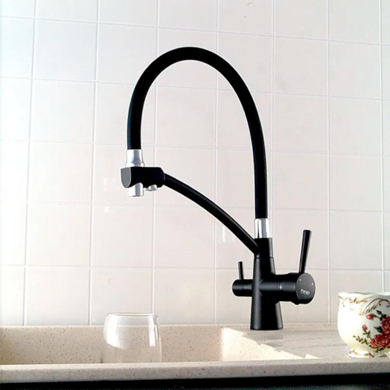 P4077BL Смеситель для кухни с гибким изливом с подключением к фильтру питьевой воды от известного в мире сантехники бренда Potato - идеальное решение для тех, кто ищет сочетание высокого качества и доступной цены. Смеситель с фильтром имеет излив, который выполнен из силикона в черном цвете. Корпус смесителя для фильтра выполнен из материала высокого качества. Такой смеситель станет идеальным решением для стилизации вашей кухни и ее интерьера. Гибкий кран для кухни с фильтром монтируется при помощи системы монтажа гайка. Размеры основания смесителя (32 мм). В смесителе водопроводная вода идет по гибкому изливу, фильтрованная - по металлическому. Изливы крутятся на 360 °. Управление осуществляется боковыми ручками. Фильтрованная подается поворотом маленького рычажка. Водопроводная управляется большим рычажком (и напор, и температура). Смеситель в цвете черный станет прекрасным решением для дизайна вашей кухни. В комплекте идет: смеситель, гибкая подводка 35 см - 2 шт и 40 см - 1шт, крепление (гайка).
