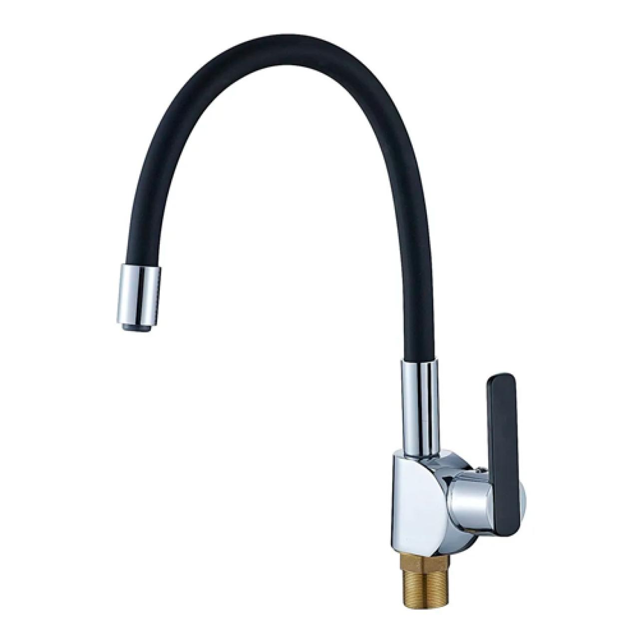 Смеситель для кухни Potato P58238-6 изготовлен из качественного цинкового сплава. Хром-никелевое покрытие корпуса улучшает внешний вид, облегчает уход и продлевает срок службы смесителя. Излив смесителя высокий, гибкий, силиконовый, чёрного цвета. Пластиковая вставка аэратора в изливе не ржавеет, долго не покрывается известковым налётом и легко очищается. В качестве регулирующего элемента применяется высоко-технологичный картридж с керамическими пластинами диаметром 35 мм. На раковину смеситель крепится с помощью удобного крепежа на гайке. К воде подключается двумя гибкими подводками 1/2" длиной 35 см.