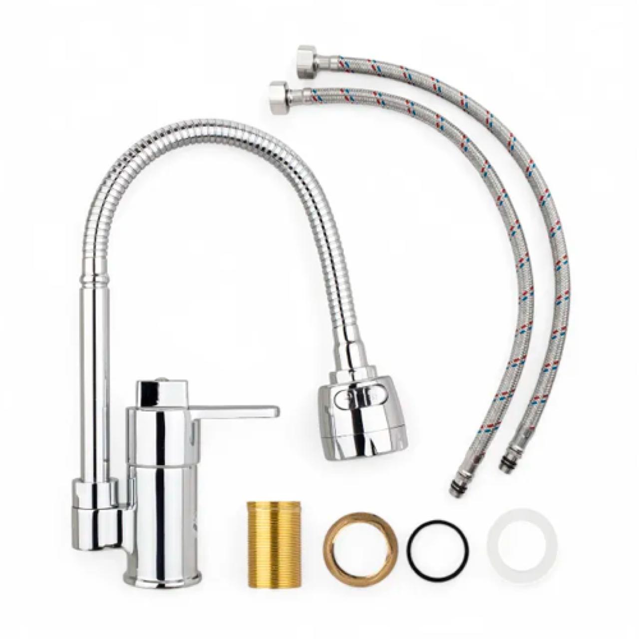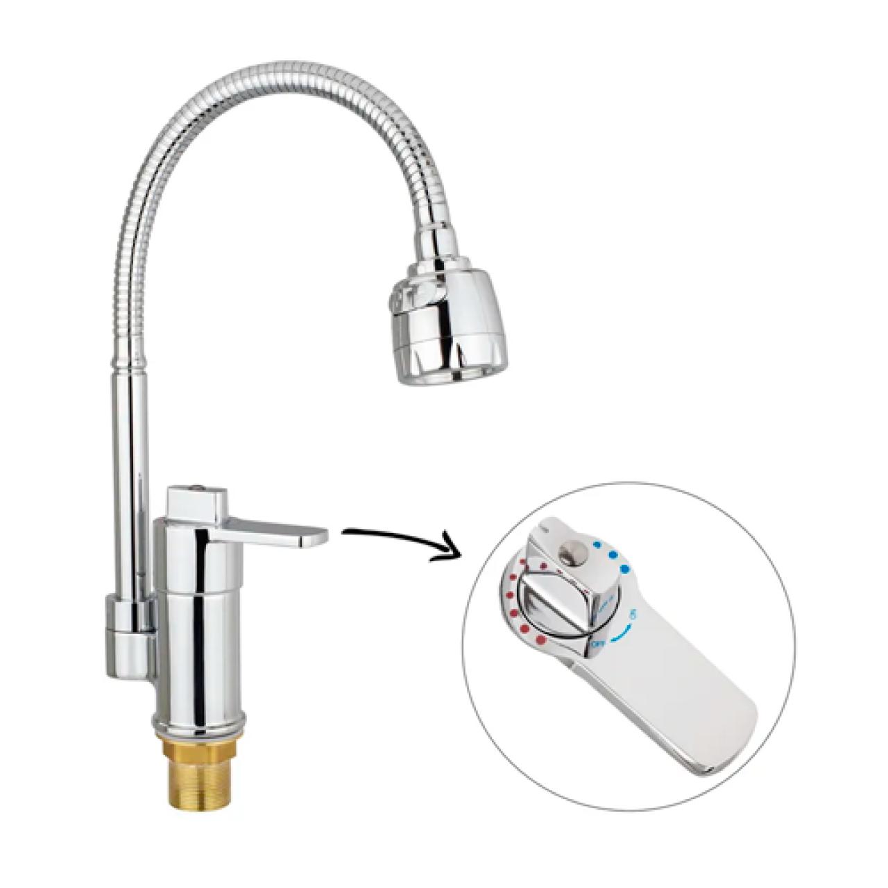 Термостатический смеситель для кухни с гибким изливом. Двухрежимный аэратор смесителя позволяет переключать режимы между многоструйным и аэрированным потоками. Аэрированный поток насыщает воду воздухом, что делает её более мягкой и приятной для использования. Многоструйный поток позволяет охватить большую площадь при использовании. Смеситель на кухню оснащён гибким изливом из нержавеющей стали в металлической оплетке, который может изгибаться в разные стороны, что позволяет легко добраться до всех уголков мойки или раковины. Картридж термостатического смесителя гарантирует плавное и точное регулирование температуры воды. Включение воды и регулировка напора осуществляется поворотом ручки по горизонтали.