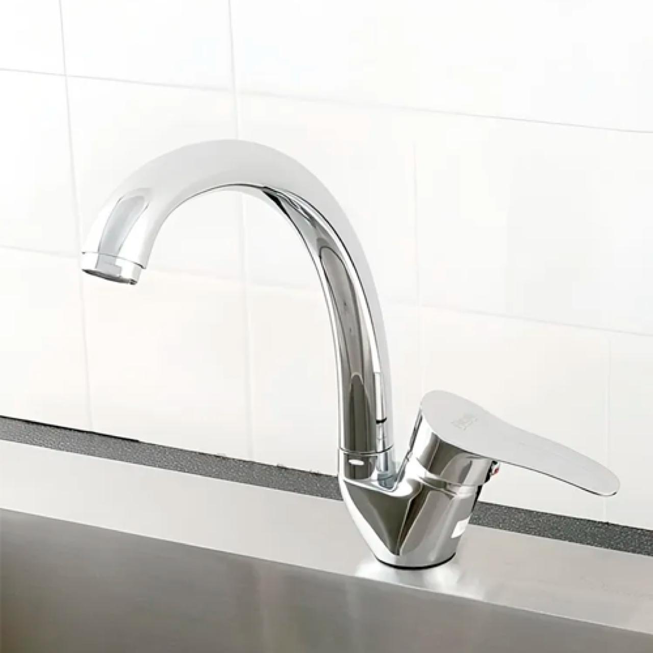 Смеситель POTATO P59214 – это однорычажный кухонный смеситель с высоким поворотным C-образным изливом, который обеспечивает большую рабочую зону и удобство мытья посуды. Корпус выполнен из прочного сплава с хромированным покрытием. Управление напором и температурой воды осуществляется с помощью удобного рычага. Надежное крепление на гайке гарантирует простую установку и устойчивость на мойке.