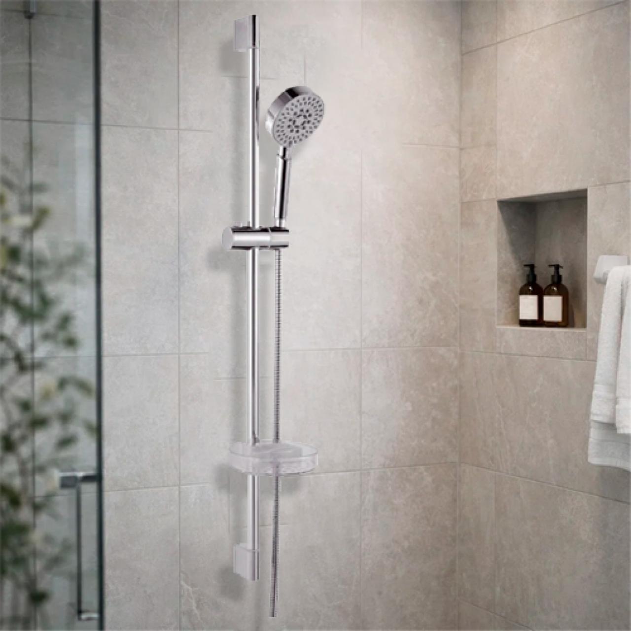 Душевой гарнитур Potato P9025 состоит из штанги круглого сечения, держателя для душевой лейки, мыльницы, лейки и шланга. Лейка пластиковая, круглая головка, три режима струи. Держатель лейки может перемещаться и фиксироваться по высоте штанги и изменять угол наклона лейки. Душевой шланг в металлической хромированной оплётке 1/2"х1/2" длиной 150 см. Изделие покрыто хром-никелевым покрытием. Крепится к стене дюбелями, входящими в комплект.