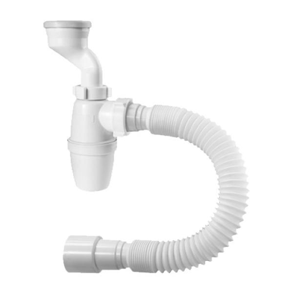 Сифон для писсуара с выпуском 1 1/4", оснащен манжетами диаметром 40 мм и 46 мм, а также гибкой трубой 40-40/50 мм.                        Вес: 0.3 кг.
