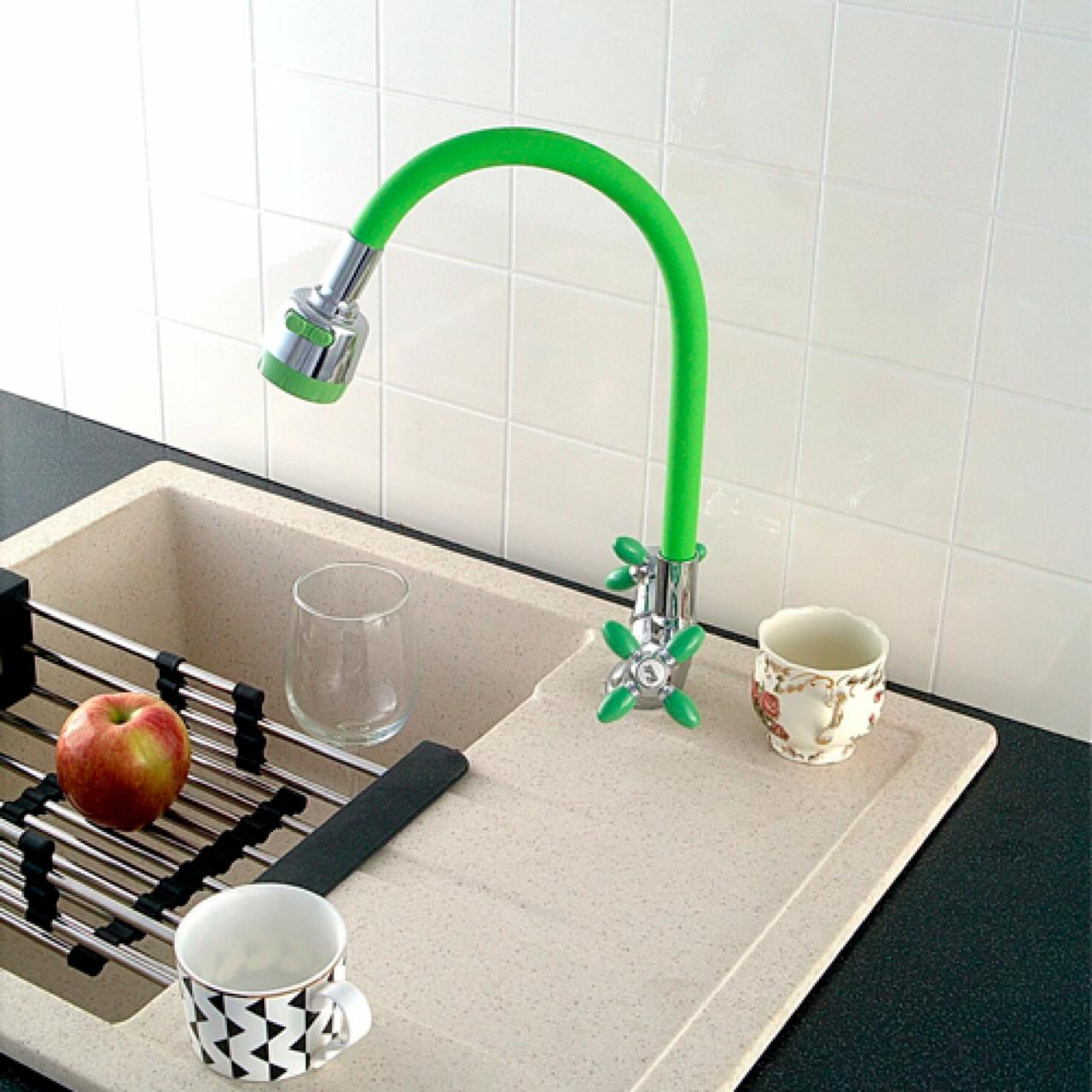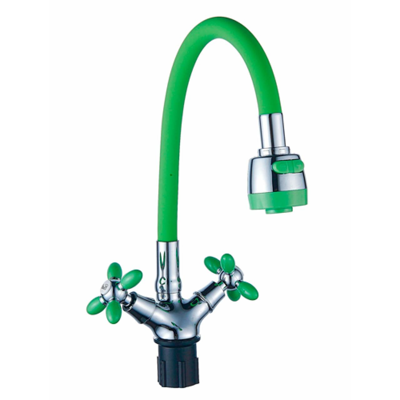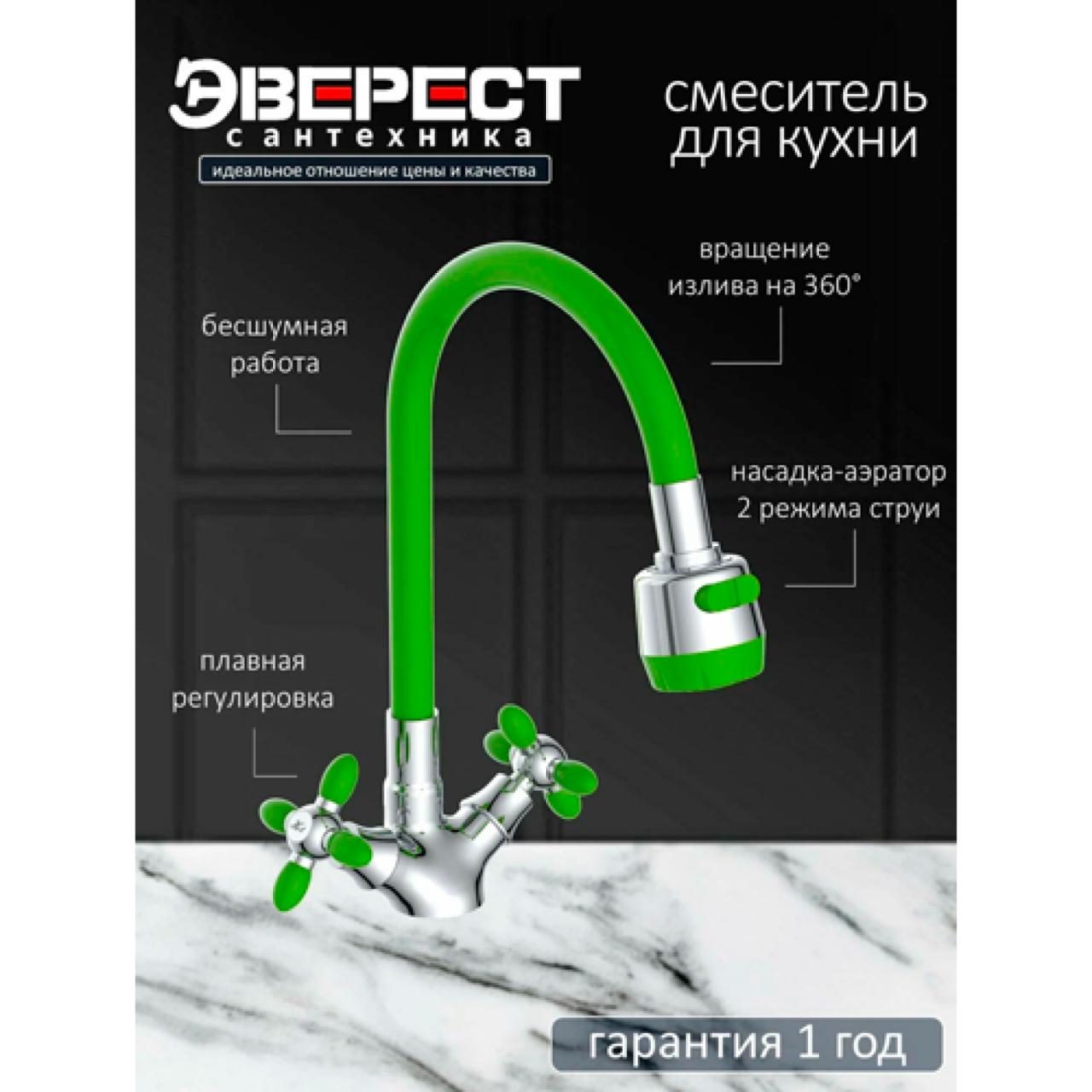 Смеситель для кухни Эверест B57-071E изготовлен из высококачественного материала. Хром-никелевое покрытие корпуса улучшает внешний вид, облегчает уход и продлевает срок службы смесителя. Излив смесителя высокий, гибкий, в зелёной силиконовой оболочке. На конце излива установлена пластиковая насадка-аэратор с двумя режимами струи: традиционной и рассеянной. Для регулировки воды применяются латунные кран-буксы с керамическими пластинами и увеличенным сроком службы. Отдельные элементы ручек и излива также зелёного цвета. На раковину смеситель крепится с помощью удобного крепежа на гайке. К воде подключается двумя гибкими подводками 1/2" длиной 35 см.