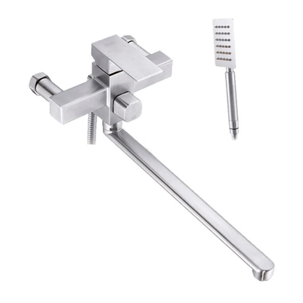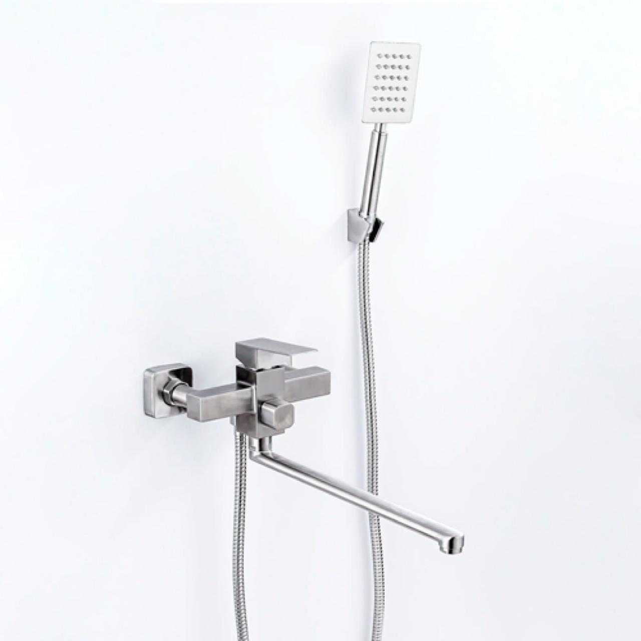 Смеситель на ванну Potato P22304S с длинным поворотным изливом целиком изготовлен из нержавеющей стали. Для регулировки воды применяется картридж 35 мм с керамическими пластинами. Излив длинный, поворотный с аэратором. Пластиковая вставка аэратора не ржавеет, долго не покрывается известковым налётом и легко чистится. Лейка так же из нержавеющей стали, 1 режим струи. Держатель лейки из нержавеющей стали, настенный на 1 положение. Лейка соединяется со смесителем душевым шлангом 1/2"х1/2" длиной 150 см. Эксцентрики и отражатели в комплекте.