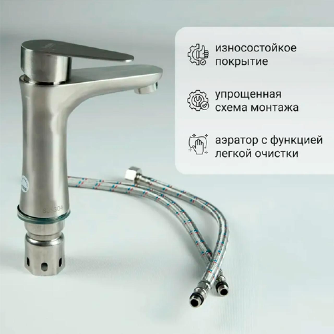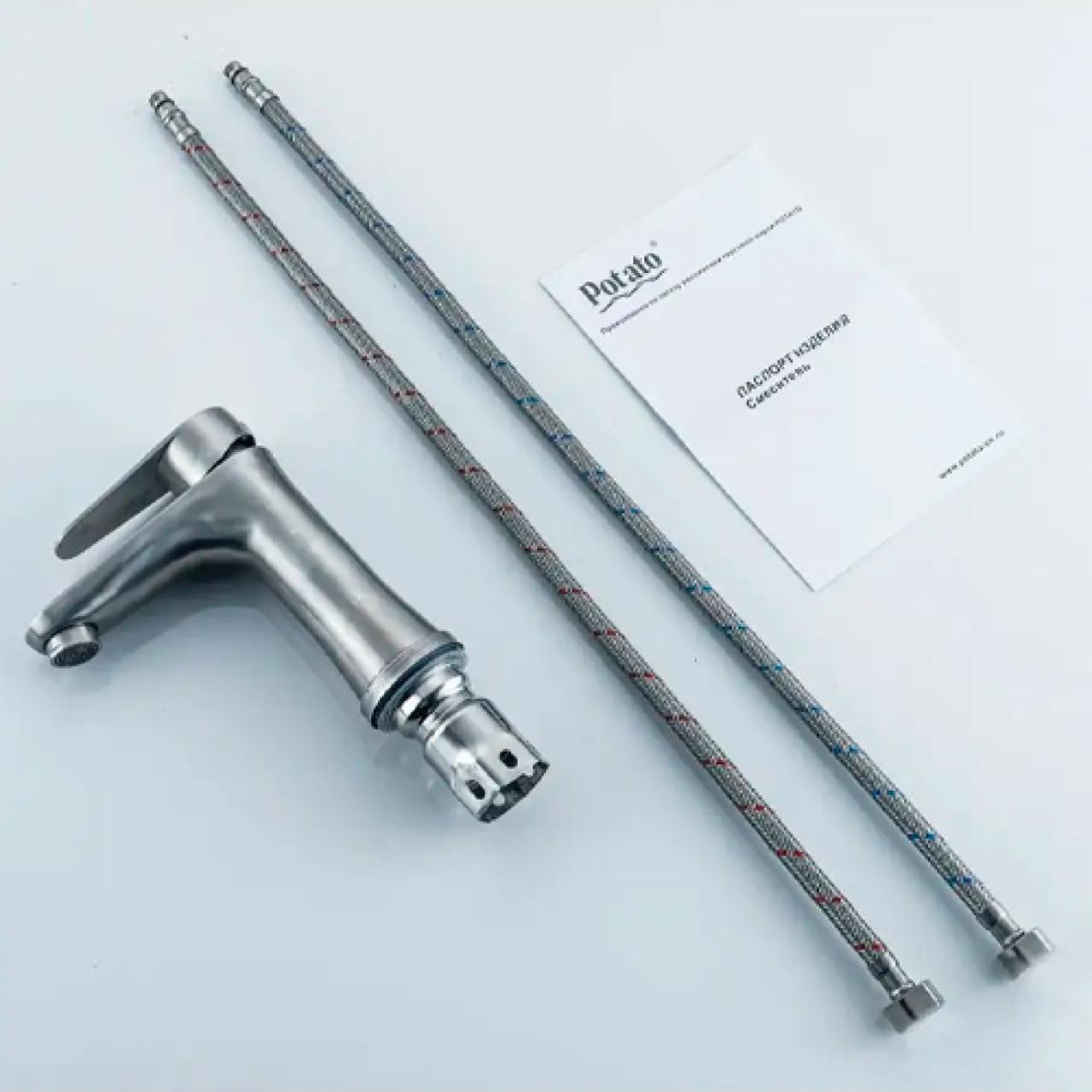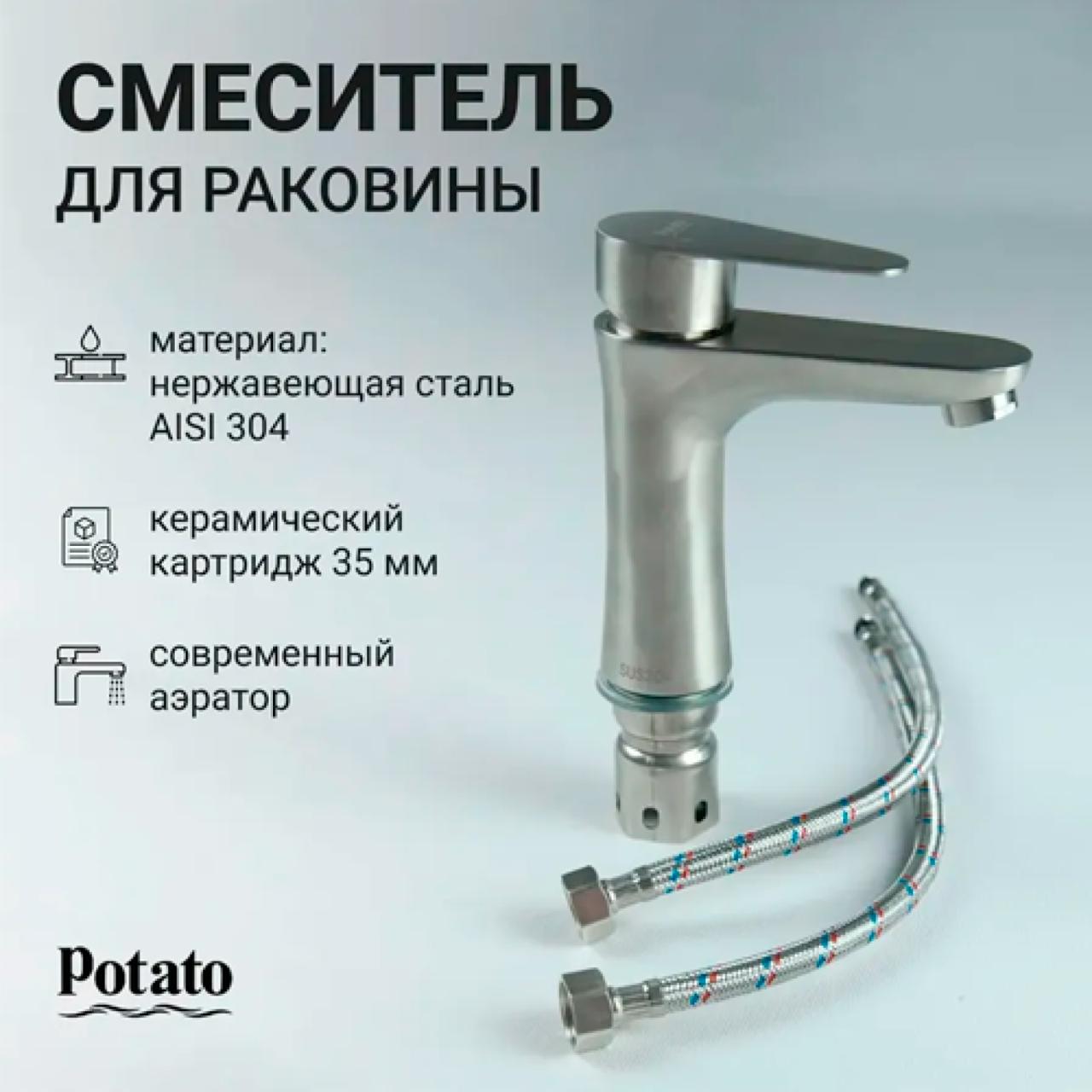 смеситель POTATO нерж, для раковины P10310S станет незаменимым аксессуаром для ванны или раковины. Выполненный из нержавеющей стали AISI 304, он не подвержен ржавчине, надежен и будет использоваться вами долгое время. Керамический картридж 35 мм. Крепление широкой гайкой из нержавеющей стали надежно закрепит смеситель на раковине и позволит произвести установку быстро и без затруднений, в комплекте есть все необходимые комплектующие.