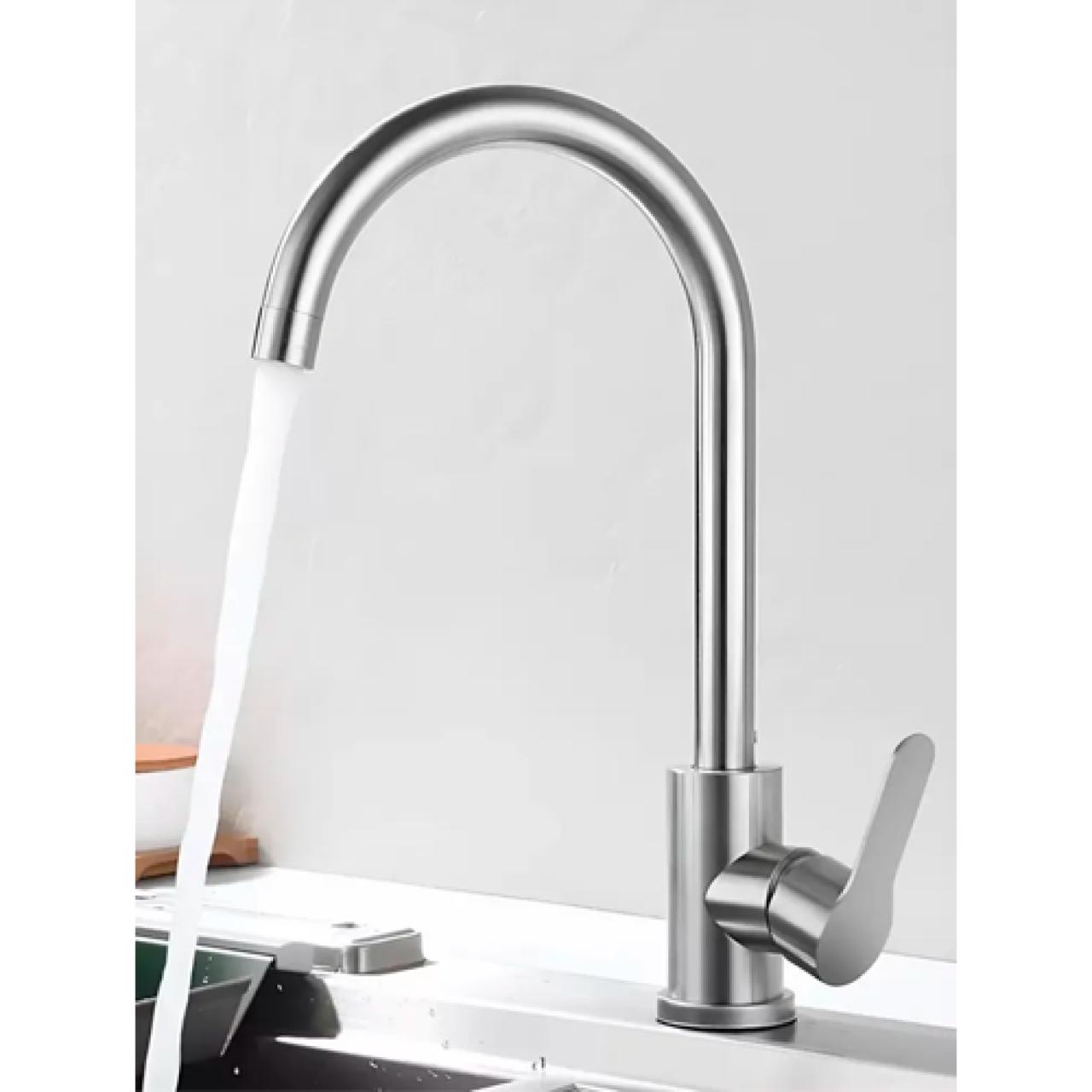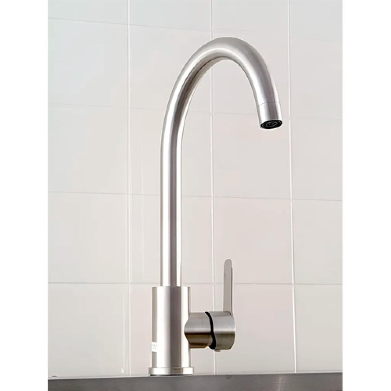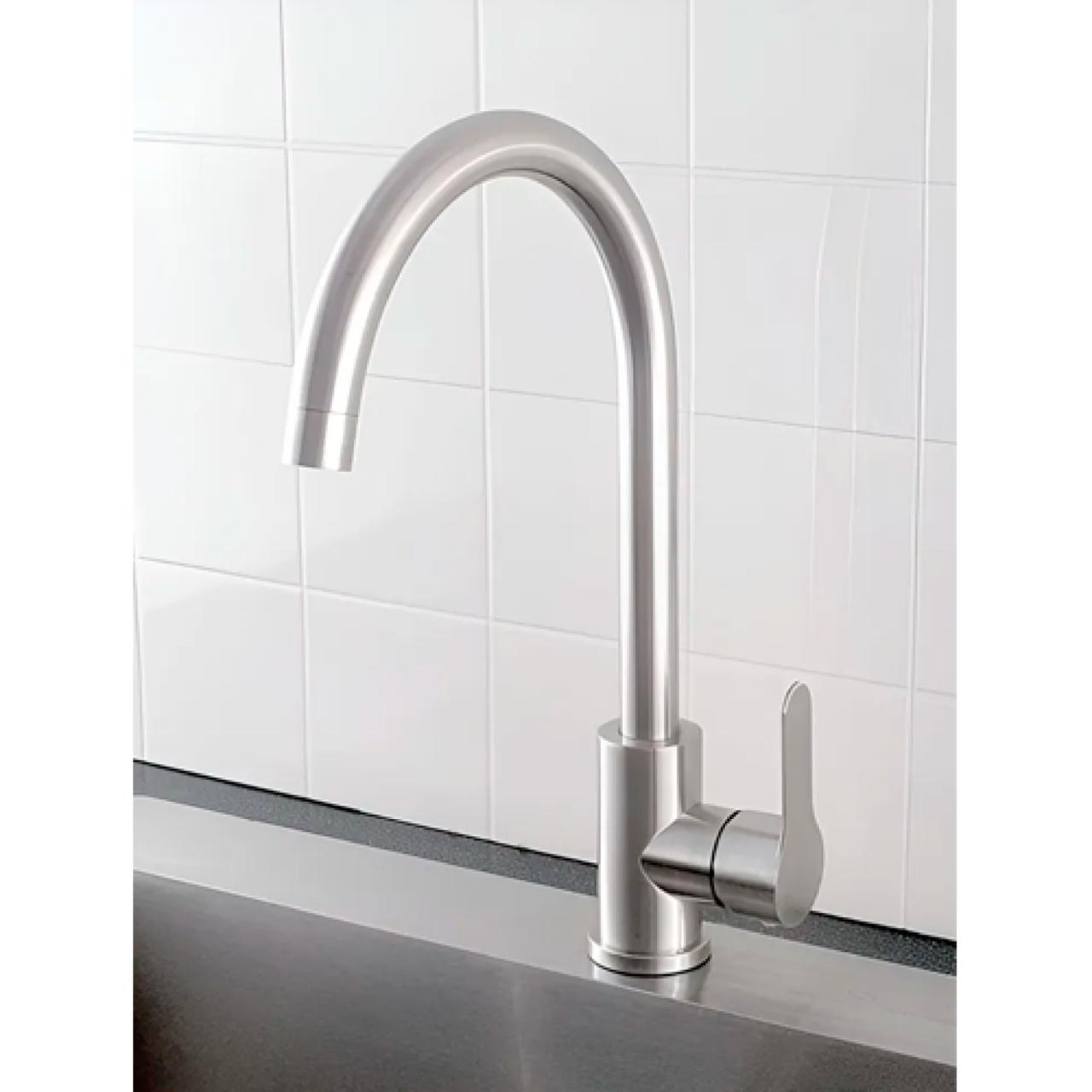 Смеситель для кухни P40303S с длинным изливом изготовлен из качественной нержавеющей стали. Стильный компактный однорычажный поворотный смеситель для раковины – отличный выбор для тех, кто ценит удобство и комфорт на своей кухне. Отлично впишется в любой интерьер и стиль квартиры, подойдет как для кухни, так и для ванной комнаты, умывальника. Универсальный кран на раковину оснащен высоким поворотным изливом, что позволяет помыть продукты без разбрызгивания воды. Модель имеет удобный, плавный рычаг управления, который легко регулирует напор и поток воды, ее температуру, а также отличается комфортным понятным управлением. За надежность конструкции отвечает керамический картридж, обеспечивая стабильную работу шарового смесителя при перепадах давления. Аэратор помогает значительно сократить денежные расходы на водных ресурсах. Гибкая подводка крана имеет универсальное соединение G 1/2'', поэтому не придется покупать дополнительные переходники, что позволит сэкономить семейный бюджет. Монтируется смеситель на горизонтальную поверхность, крепится на кухонной мойке или на специально отведенном месте на столешнице посредством металлической гайки для быстрой установки.