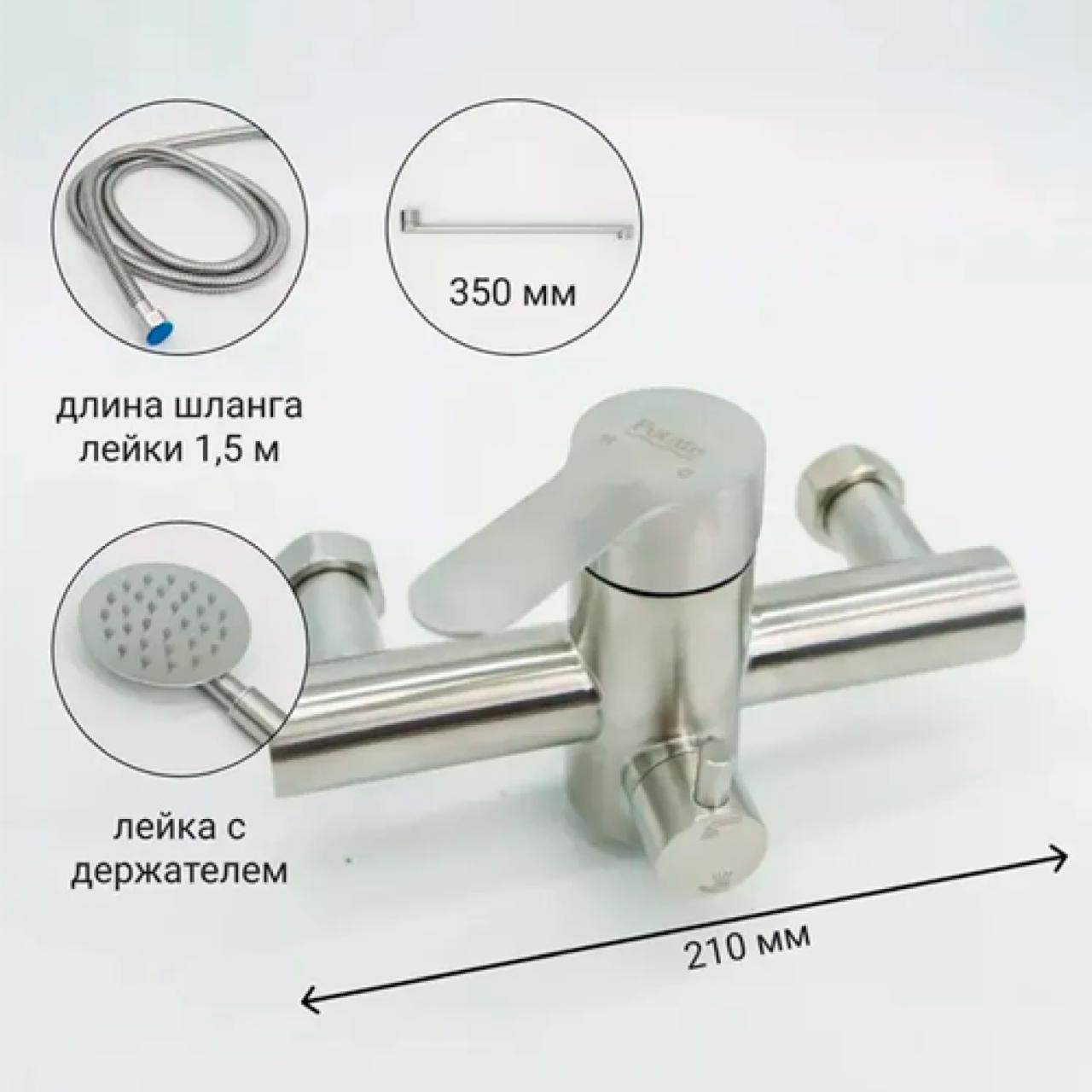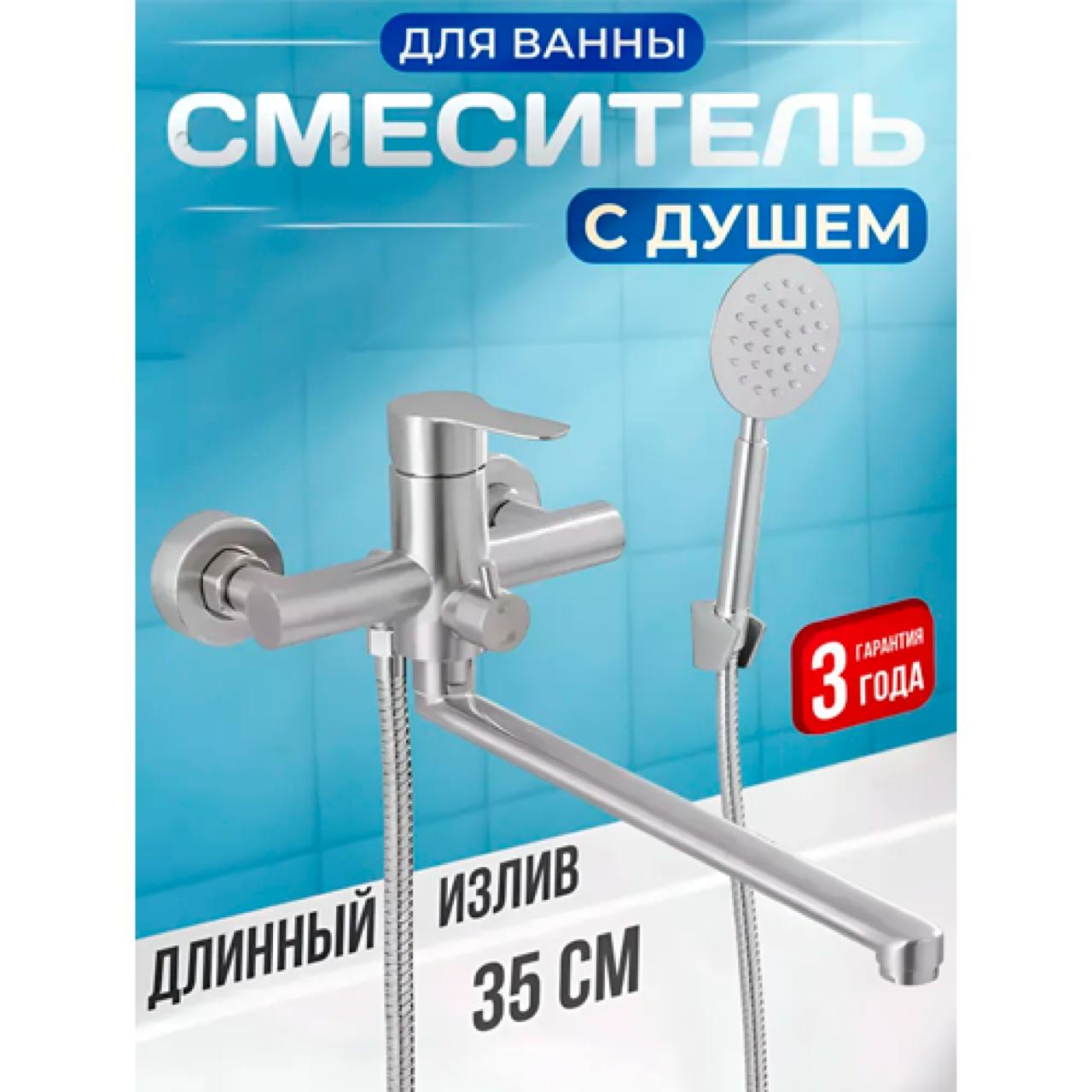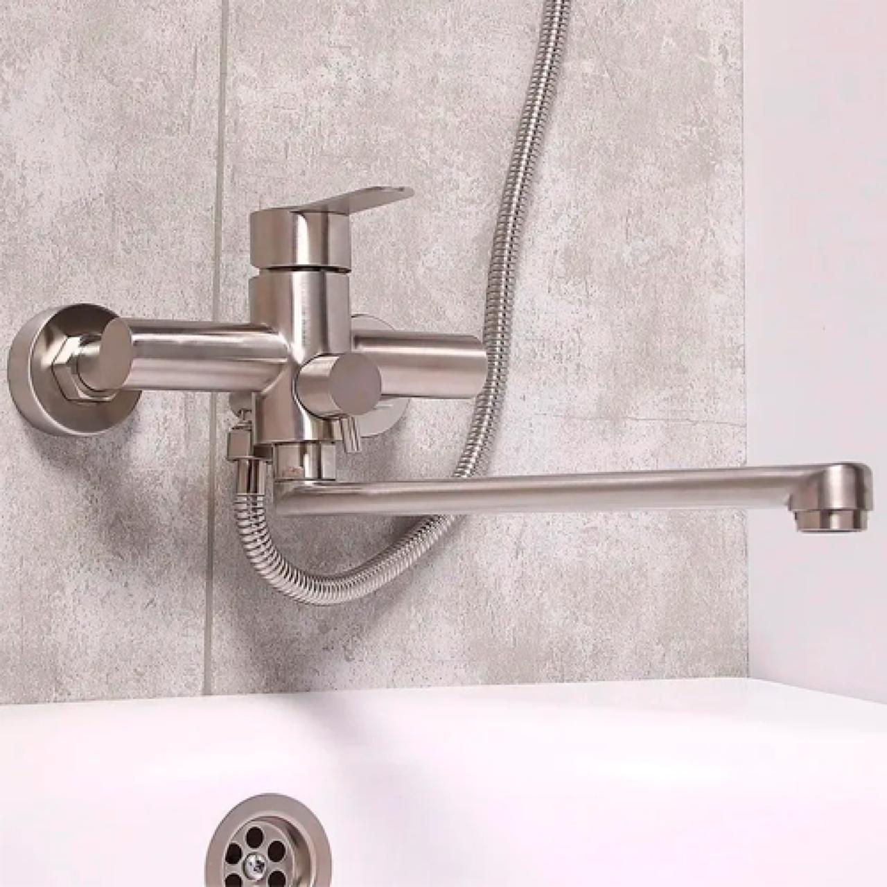 Смеситель для ванны с душем P22303S - универсальный рычажный кран с длинным поворотным изливом. Сатиновый смеситель в ванную комнату с душевым гарнитуром изготовлен из высококачественной нержавеющей стали SUS304, имеет матовое покрытие сатин. Кран на ванну снабжен керамическим картриджем 35 мм для регулировки напора и температуры воды. Длина прямого излива 35 см, на конце плоского гусака вкручен съемный аэратор. Сантехническое изделие для душевой имеет поворотный переключатель на душ, кран-букса с углом поворота 90 градусов. Душевая система в квартиру с набором для душа. В комплекте шланг для душа 1,5 метра (150 см) в металлизированной оплетке, металлическая лейка душевая 1 функциональная из нержавейки и настенный держатель для лейки. Аксессуар для ванной монтируется на стену в два отверстия, подключается к холодной и горячей воде, эксцентрики переходники 3/4х1/2 с декоративными отражателями входят в комплектация с краном для настенного монтажа.