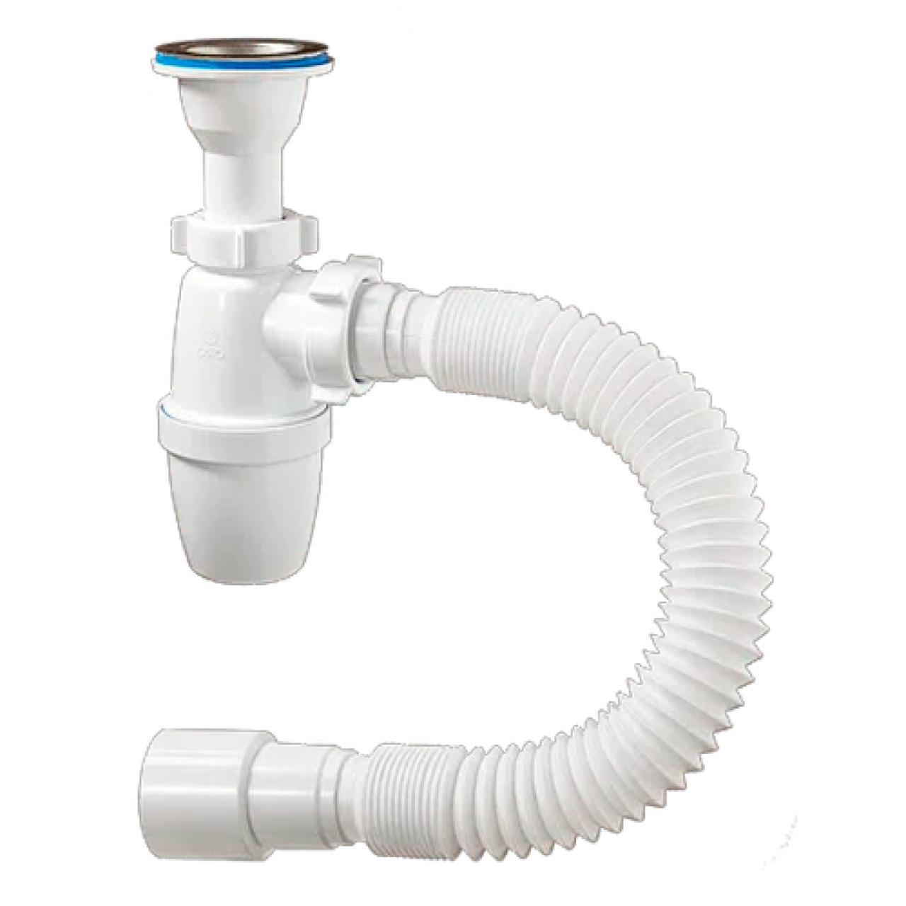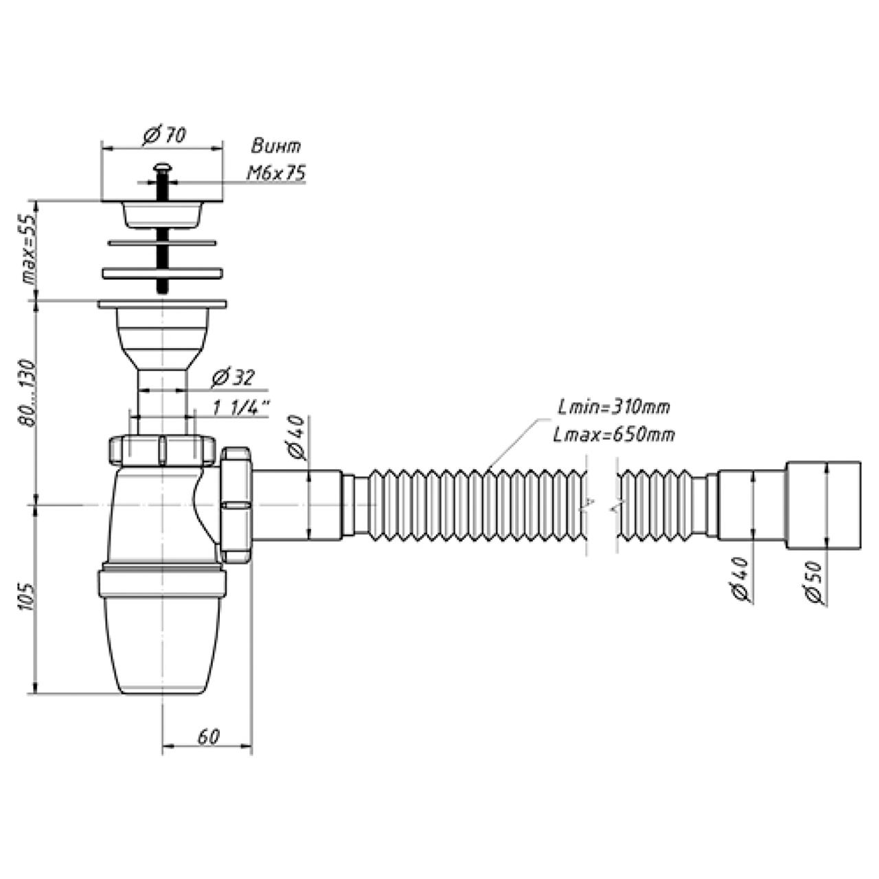 Сифон с малым корпусом и отстойником, литым выпуском с нержавеющей чашкой д.70мм и отводом в канализацию гибкой трубой 40-40/50. В комплекте идёт полированная нержавеющая чашка д.70мм. Сифон комплектуется нержавеющим винтом длиной 75мм и нержавеющей гайкой. Длина отвода в канализацию от 310 до 650мм. Отвод имеет два диаметра подключения к канализации 40 и 50мм.