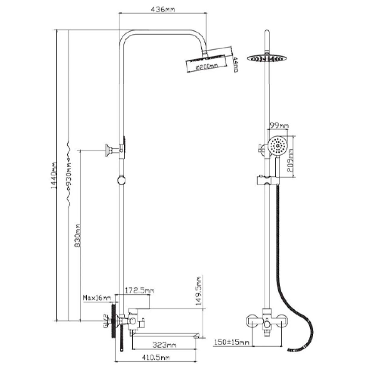 Комплектация: Верхний душ, Душевая лейка, Душевая штанга, Излив, Смеситель, Шланг для душа