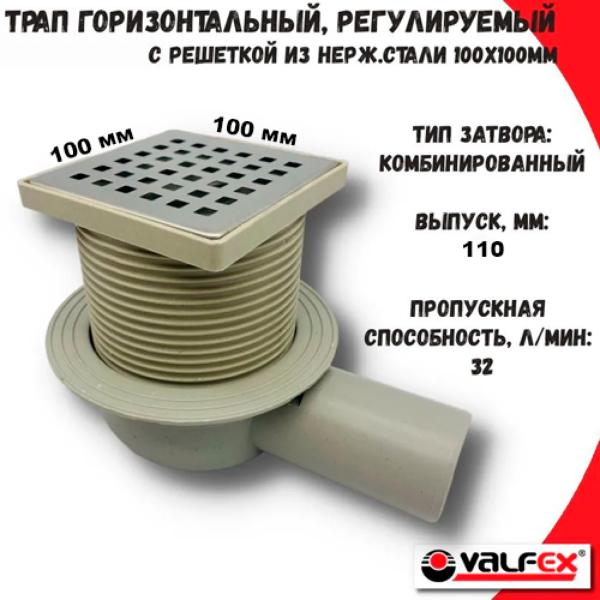 Трап горизонтальный 100x100 мм выпуск Ø 110 мм, регулируемый, комбинированный затвор, решётка из нержавеющей стали VALFEX (19)