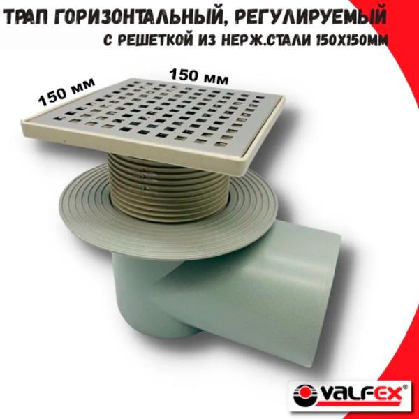 Трап горизонтальный 150x150 мм выпуск Ø 110 мм, регулируемый, комбинированный затвор, решётка из нержавеющей стали VALFEX (15)