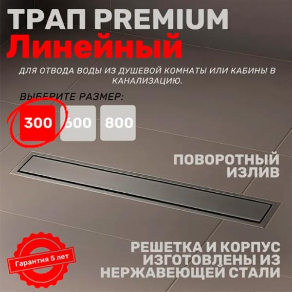 Трап лин. PR 300 мм нерж. ст. Ø40-50 мм, горизонт. отвод, комб. затв., реш. №6 из нерж. ст. VALFEX (6)