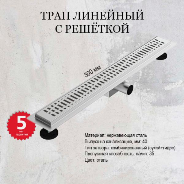 Трап лин. PR 300 мм нерж. ст. Ø40-50 мм, горизонт. отвод, комб. затв., реш. №6 из нерж. ст. VALFEX (6)