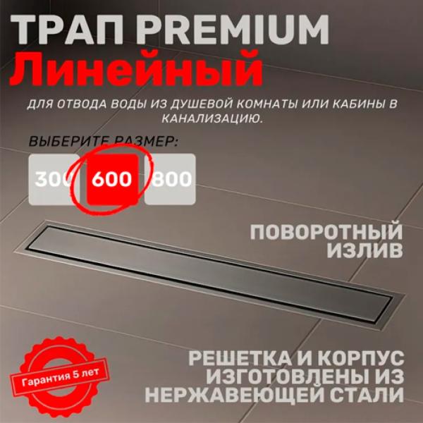 Трап лин. PR 600 мм нерж. Ø 50 мм, гориз. отв., пов. излив, комб. затв., реш. №7 из нерж. VALFEX (6)