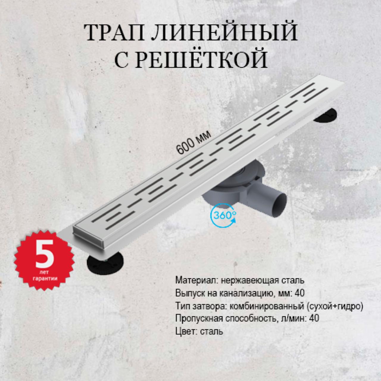 Трап лин. PR 600 мм нерж. ст. Ø40-50 мм, горизонт. отвод, комб. затв., реш. №6 из нерж. ст. VALFEX (6)