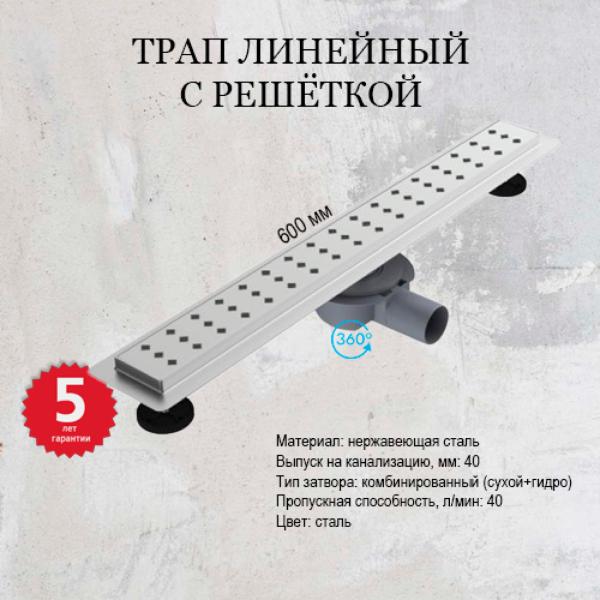 Трап лин. PR 600 мм нерж. ст. Ø40-50 мм, горизонт. отвод, комб. затв., реш. №6 из нерж. ст. VALFEX (6)