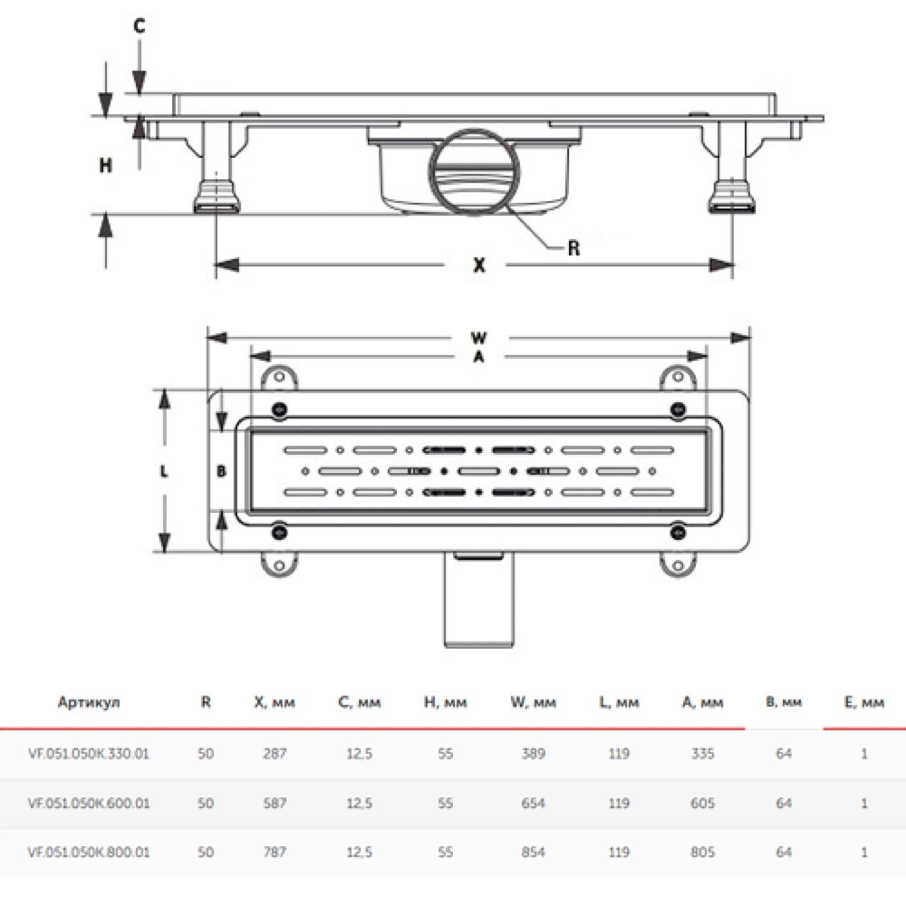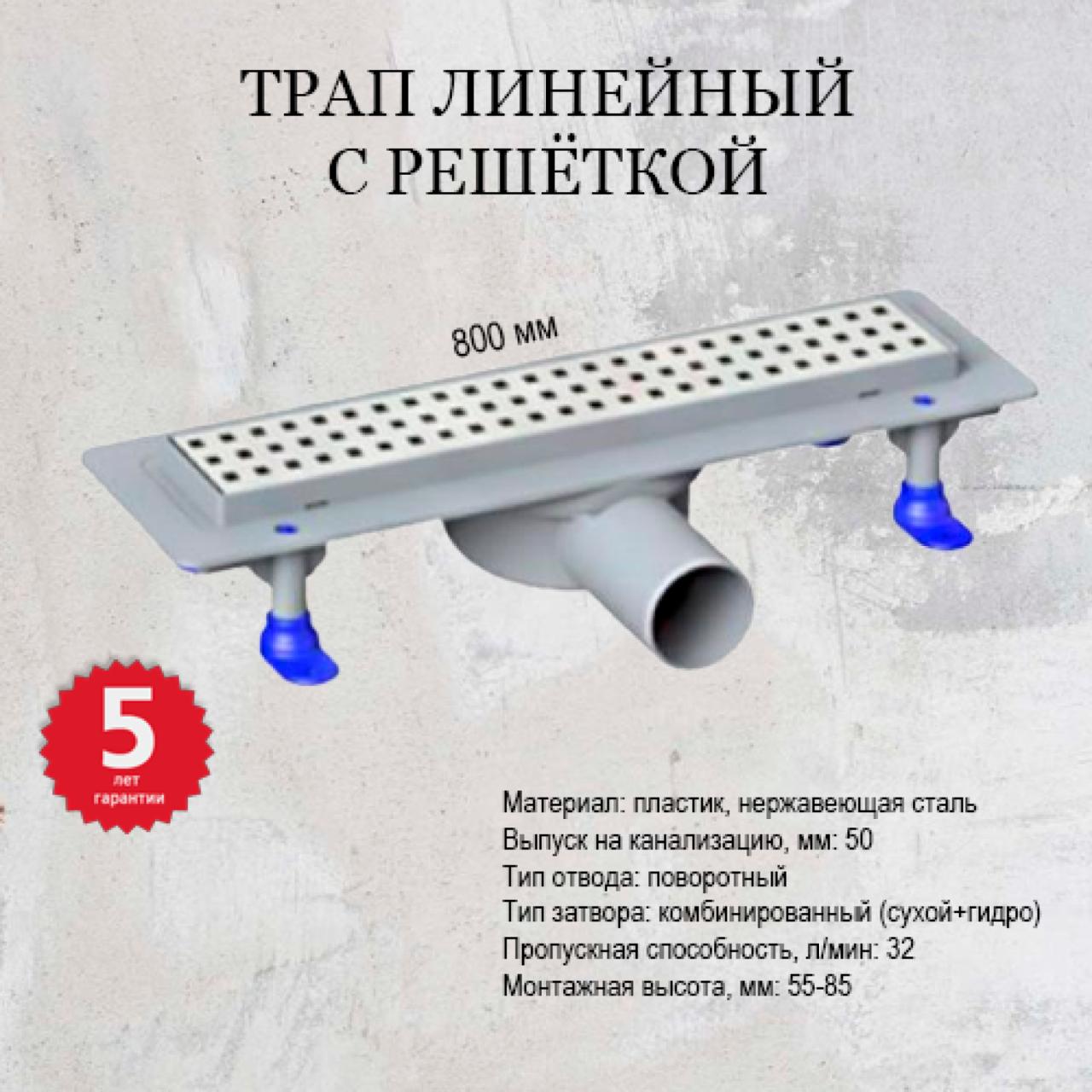Трап линейный 800 мм пластиковый, выпуск Ø 50 мм, поворотный отвод, комбинированный затвор, решётка из нержавеющей стали VALFEX (12)