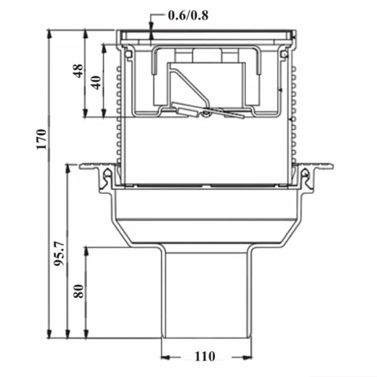 Трап вертикальный 100x100 мм выпуск Ø 110 мм, регулируемый, комбинированный затвор, решётка из нержавеющей стали VALFEX (19)